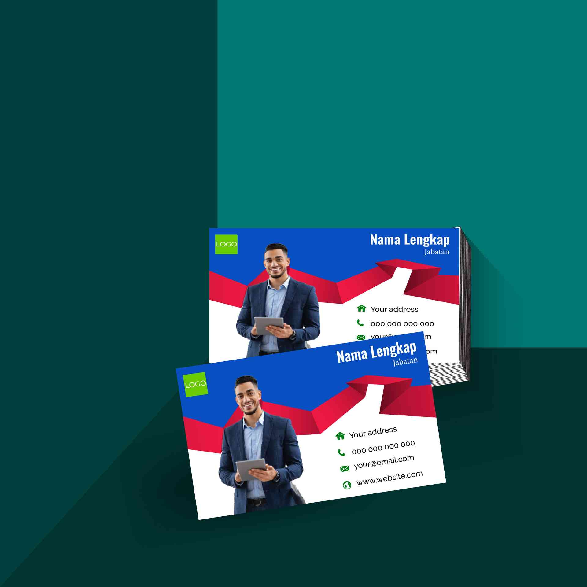 Kartu nama korporat ini berbentuk persegi panjang dengan nuansa biru ombak futuristik yang memberi kesan modern dan profesional. Warna dominan adalah gradasi biru dengan elemen visual berupa gelombang dinamis, menonjolkan estetika elegan dan formal. Desain menampilkan foto karakter pria berjas, menyiratkan target pasar profesional atau pebisnis. Tata letak informasi rapi dengan ikon kontak dan ruang jelas untuk nama, jabatan, serta logo perusahaan, cocok digunakan dalam kegiatan bisnis, networking, atau sebagai identitas profesional perusahaan.