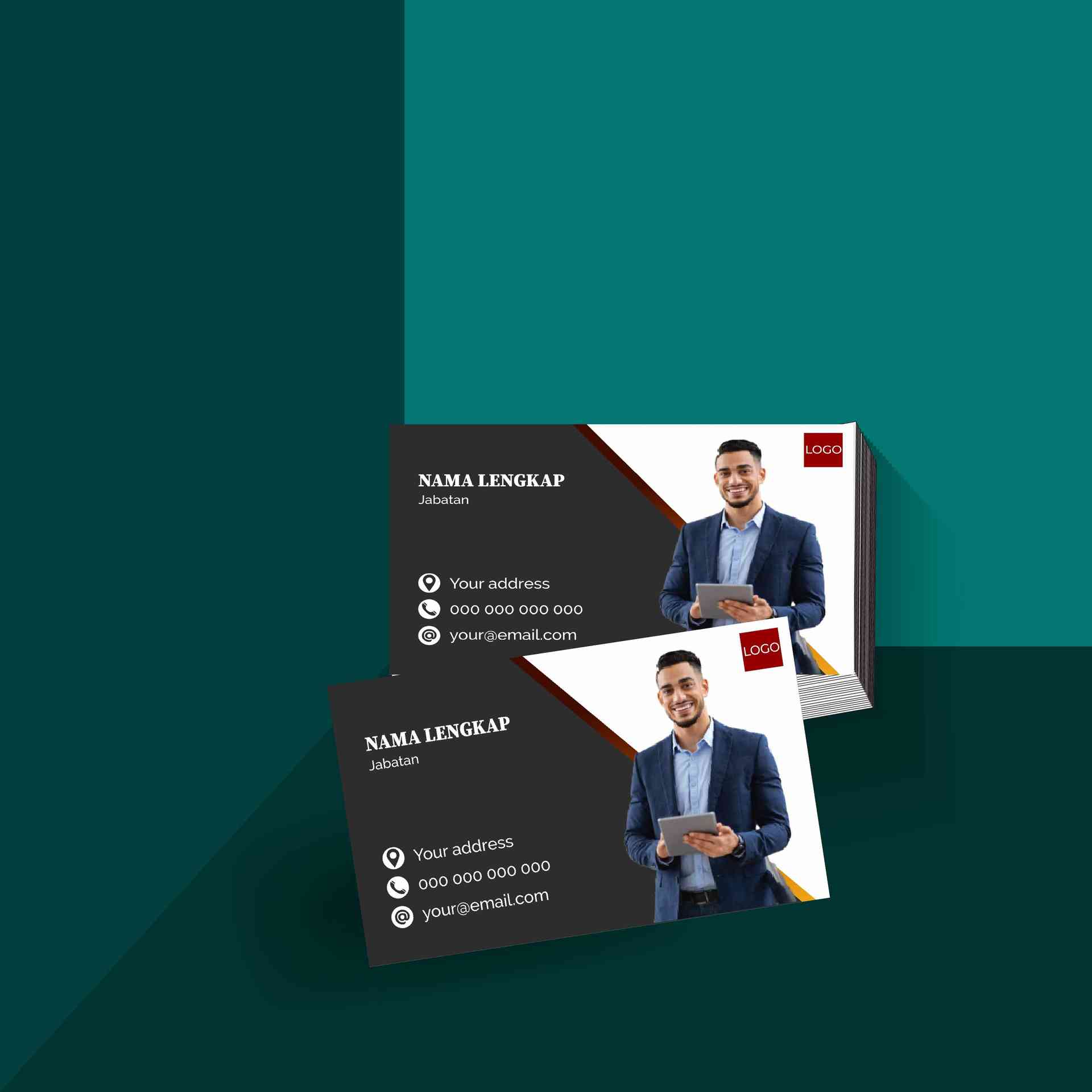 Kartu nama berdesain kombinasi biru dan oranye ini tampil modern dan dinamis, menonjolkan karakter profesional melalui pemilihan warna kontras serta t...