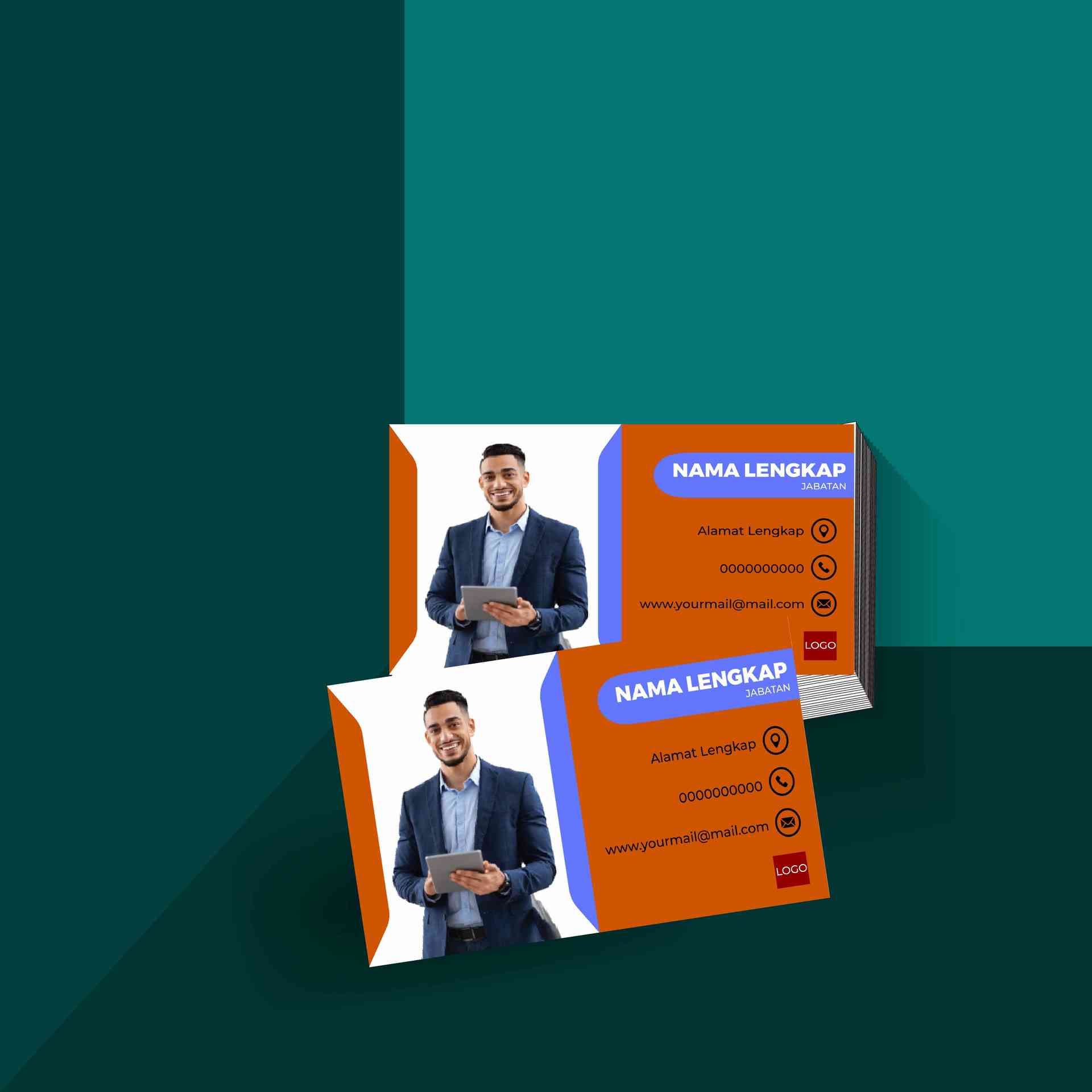 Kartu nama berdesain kombinasi biru dan oranye ini tampil modern dan dinamis, menonjolkan karakter profesional melalui pemilihan warna kontras serta t...