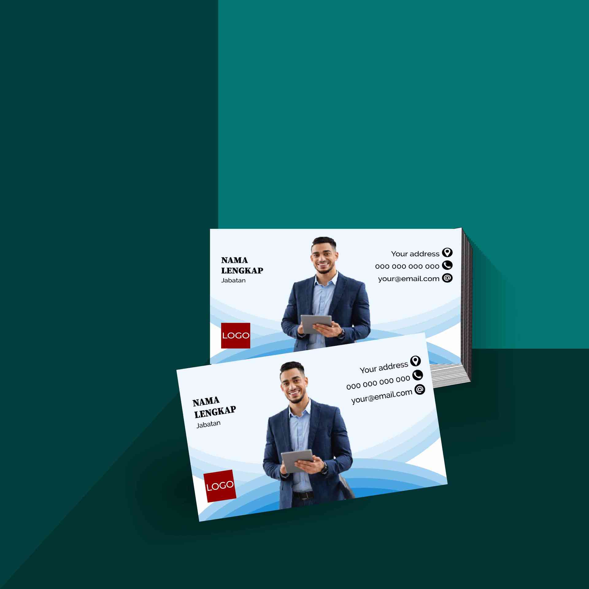 Kartu nama formal berdesain profesional ini berbentuk persegi panjang horizontal dengan dominan warna biru laut dan sentuhan gradasi biru muda pada po...