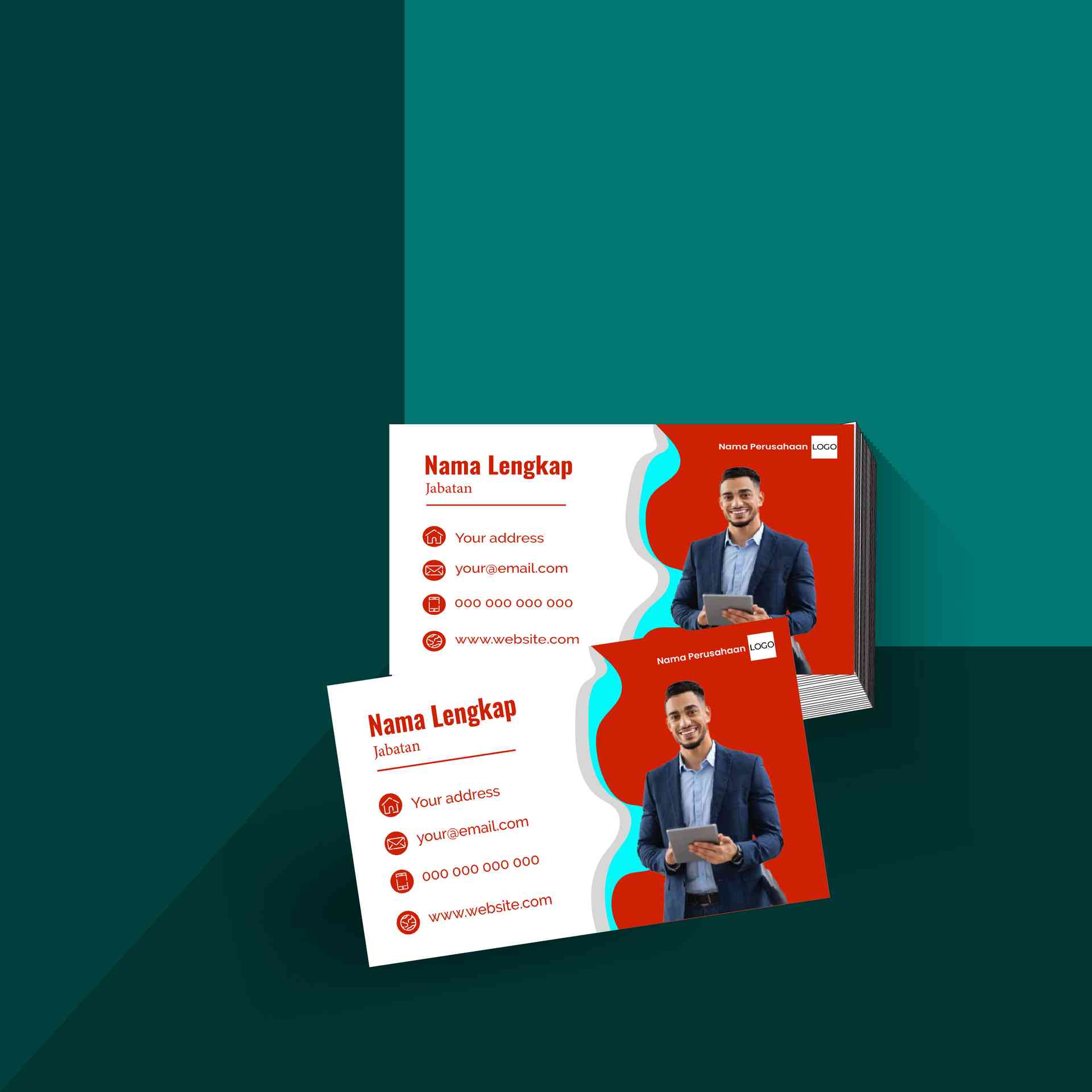 Kartu nama stylish berbentuk persegi panjang ini didominasi warna merah dan pink dengan aksen hijau neon yang mencolok, menciptakan kombinasi visual e...