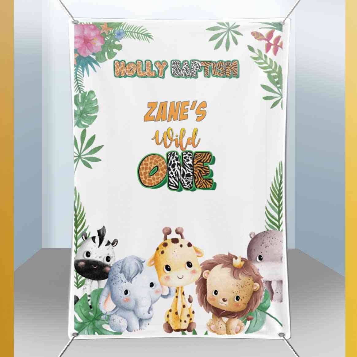 Deskripsi Desain Banner "Zane's Wild One - Holly Baptism":Desain banner ini memadukan nuansa liar yang menggemaskan dengan tema hutan tropis dan binat...
