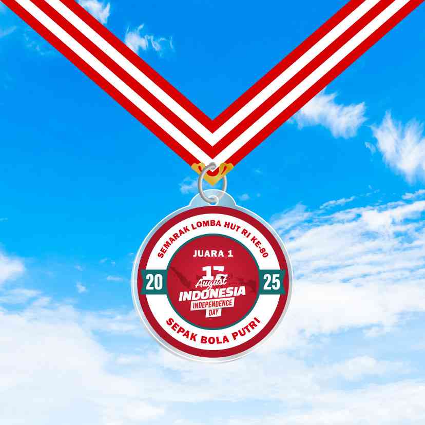 Desain medali ini menonjolkan nuansa ceria dan patriotik, dengan elemen visual bendera dan ornamen khas kemerdekaan. Warna merah-putih yang dominan me...