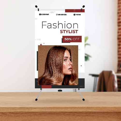 Mini standing banner dengan tema Fashion Stylish Salon menonjolkan desain vertikal ramping, didominasi warna putih, merah marun, dan hitam, serta mena...