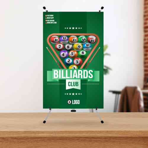 Mini standing banner dengan tema Billiards Club menampilkan desain vertikal berbentuk persegi panjang dengan warna dominan hijau, menonjolkan visual b...