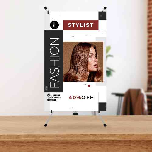 Mini standing banner berukuran kecil dengan desain visual dominan warna putih, hitam, dan coklat, menampilkan karakter perempuan bergaya modis di bagian kiri. Judul besar “BEAUTY SALON” dan penawaran diskon 50% tercetak jelas, dilengkapi daftar layanan seperti cleaning, facial, hair, nail, dan make-up. Elemen desain berupa garis dan blok geometris memperkuat tampilan modern dan profesional. Produk ini dikonsep sebagai media promosi usaha salon kecantikan, cocok diletakkan di meja resepsionis, event pameran, atau area tunggu untuk menarik perhatian pelanggan perempuan yang peduli penampilan.
