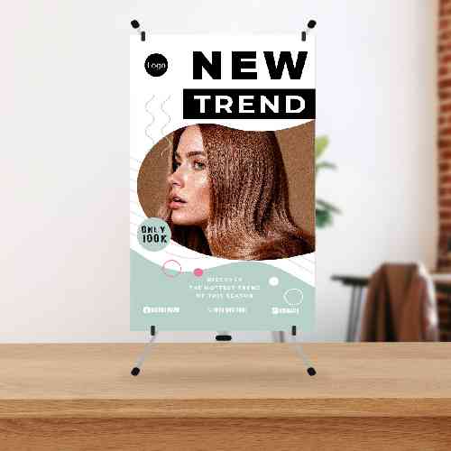Mini Standing Banner Salon Fashion berbentuk vertikal dengan desain modern yang menampilkan foto close-up model wanita berambut panjang, menonjolkan t...