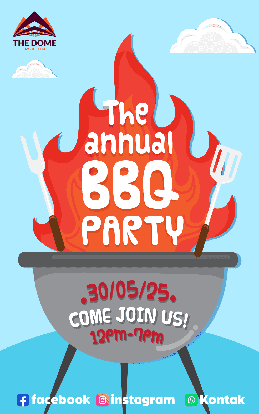 Mini standing banner dengan tema BBQ Party ini menampilkan ilustrasi grill berwarna abu-abu dengan api merah-oranye besar di tengahnya, diapit alat ba...