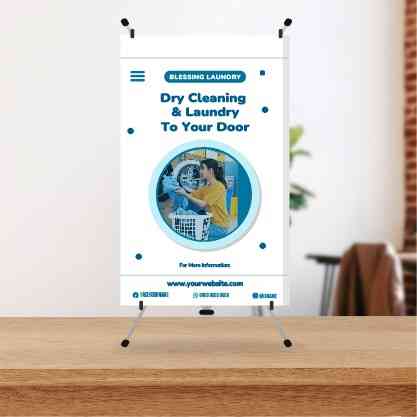 Mini standing banner bertema laundry ini berbentuk persegi panjang vertikal dengan warna dominan biru cerah, menampilkan ilustrasi mesin cuci berisi pakaian, busa sabun, setrika, dan kemeja menggantung di sebelah kanan. Desain visual mencolok dengan gambar kartun bernuansa profesional dan tulisan besar "Blessing Laundry" pada bagian atas, menciptakan kesan bersih, segar, dan modern. Fungsi utamanya untuk promosi usaha laundry, target pasar jasa pencucian pakaian, dan dapat digunakan sebagai media promosi di konter, meja front office, atau area tunggu pelanggan.