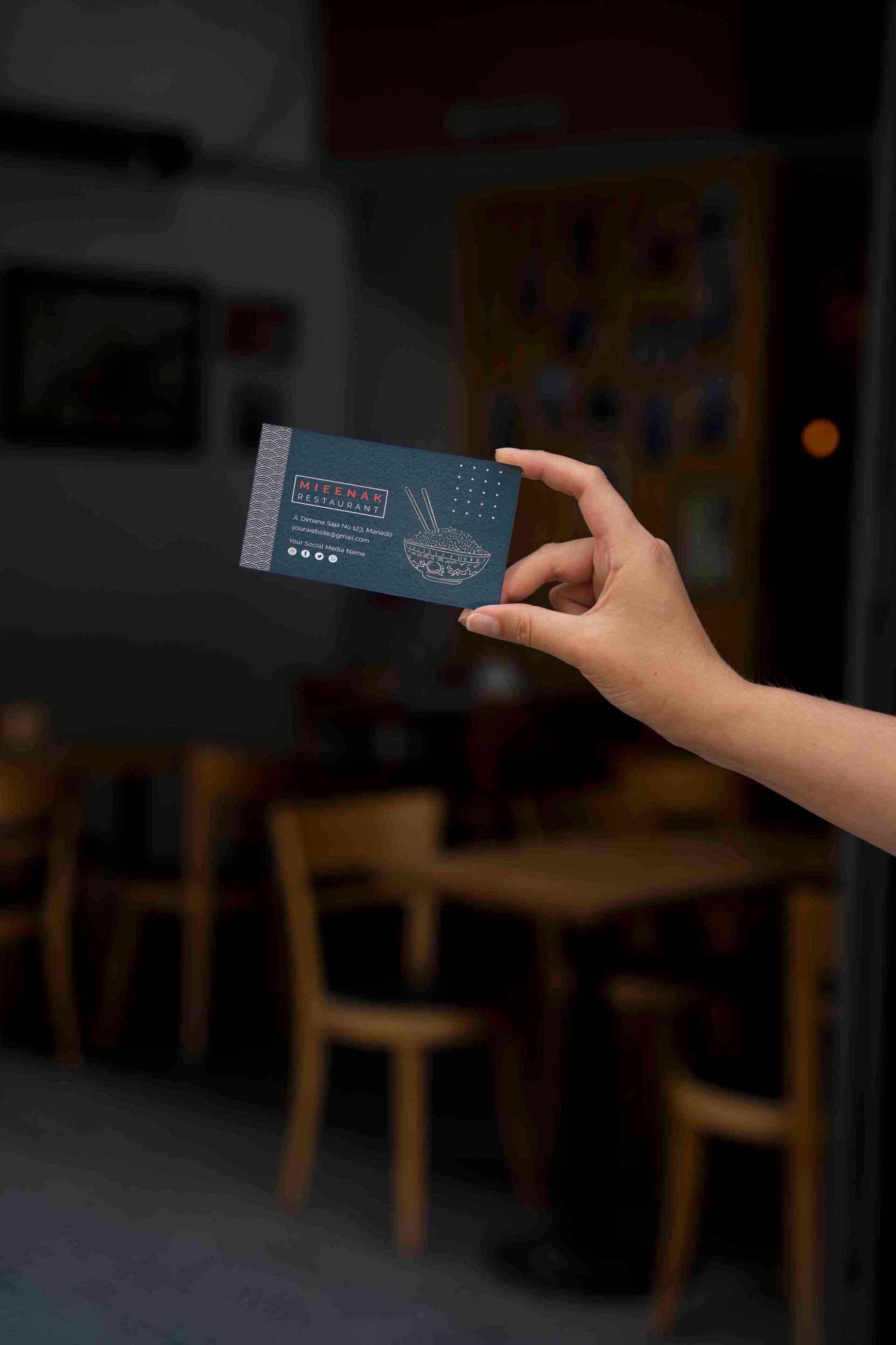 Kartu nama untuk restoran mie ini berbentuk persegi panjang dengan dominasi warna biru dongker, menampilkan desain modern dan minimalis. Elemen visual...
