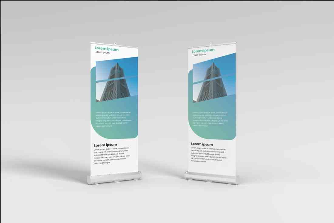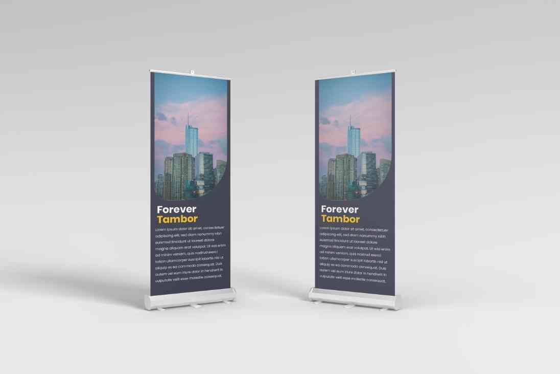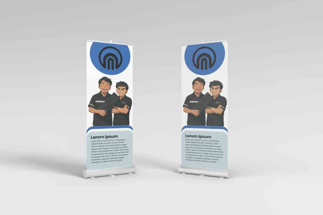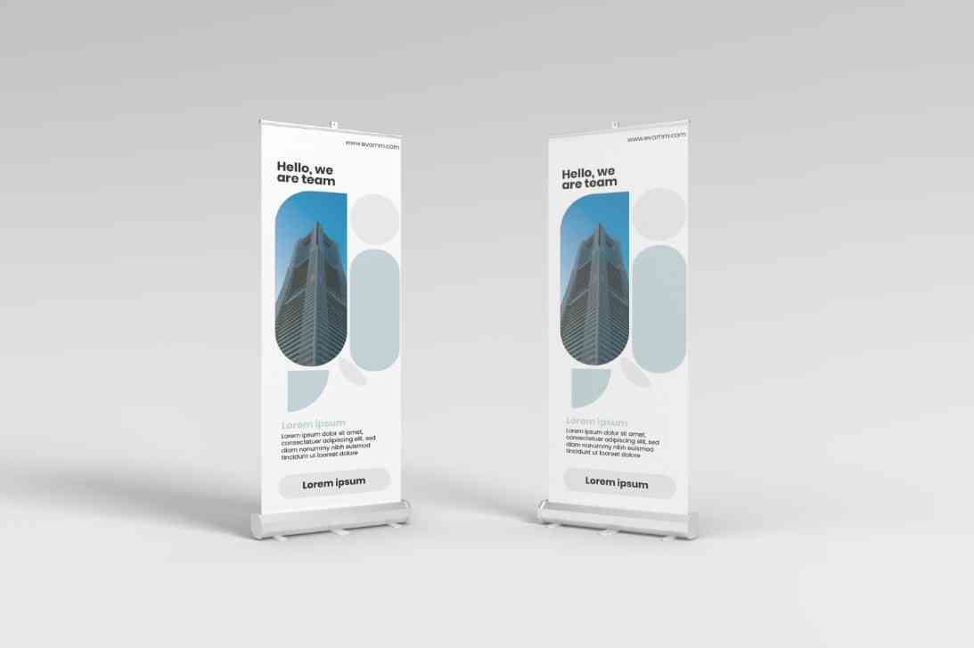 This banner design features a sleek, minimalist layout with a modern corporate aesthetic. The use of a monochromatic color scheme, combining dark blues and light accents, complements the clean design. The central focus is a modern logo symbol, symbolizing strength and unity. The banner also includes space for informative content, with placeholder areas for text such as company descriptions or announcements. The photo elements of an elegant workspace and a city skyline further emphasize the company’s professionalism and commitment to modernity. Ideal for corporate branding, business exhibitions, or promotional events.