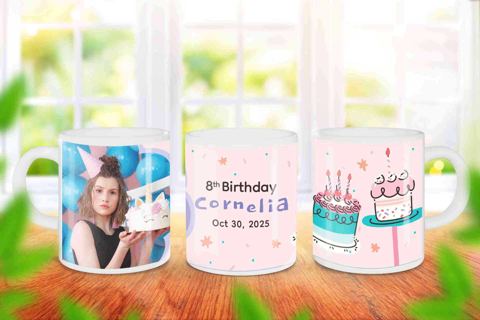 Mug souvenir ulang tahun anak menampilkan desain personalisasi dengan foto anak, gambar kue ulang tahun, dan nama serta tanggal perayaan pada permukaa...