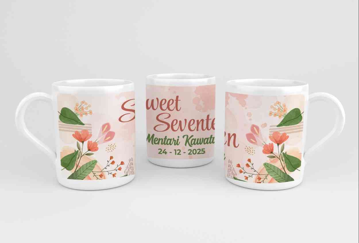 Mug bertema Sweet Seventeen ini berdesain elegan dengan dominasi warna ungu pastel, menampilkan elemen utama berupa ilustrasi floral yang terdiri dari bunga putih dan ungu serta dedaunan hijau disertai aksen beri oranye. Bagian depan mug memuat tulisan nama dan tanggal spesial dengan tipografi modern yang lembut, berlatar angka “17” transparan. Tema visual floral yang feminin dan warna pastel menjadikan mug ini cocok sebagai souvenir ulang tahun sweet seventeen, menyasar remaja perempuan serta tamu undangan pesta bertema elegan dan personal.