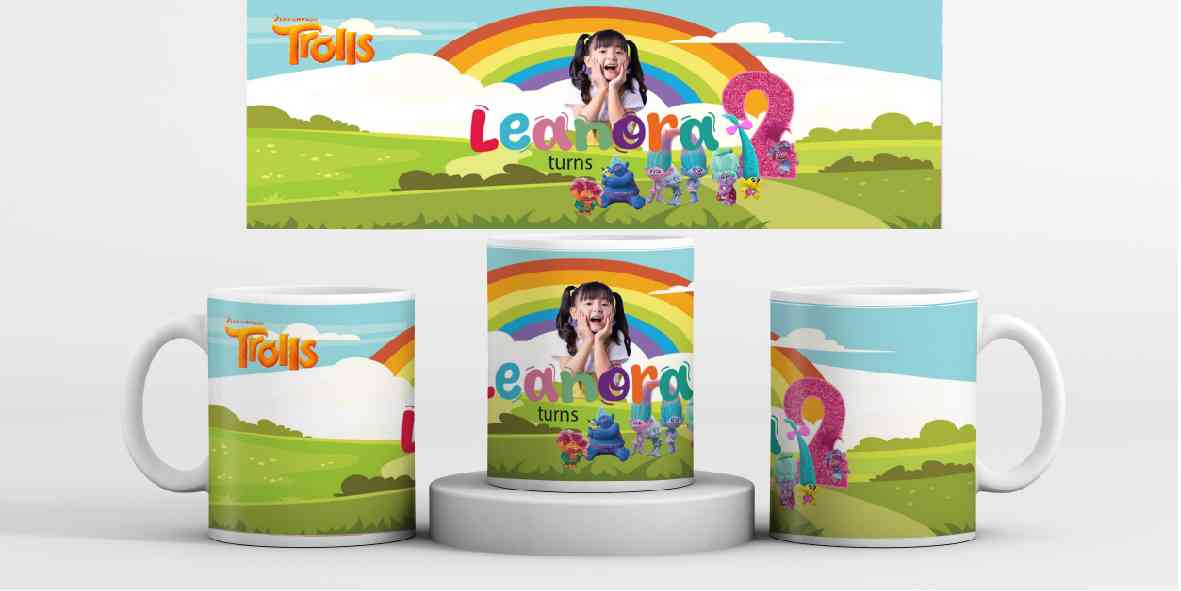 Mug ulang tahun ini menampilkan desain ceria bertema kartun Trolls, dengan karakter-karakter ikonik yang penuh warna. Di bagian depan mug, ada gambar...