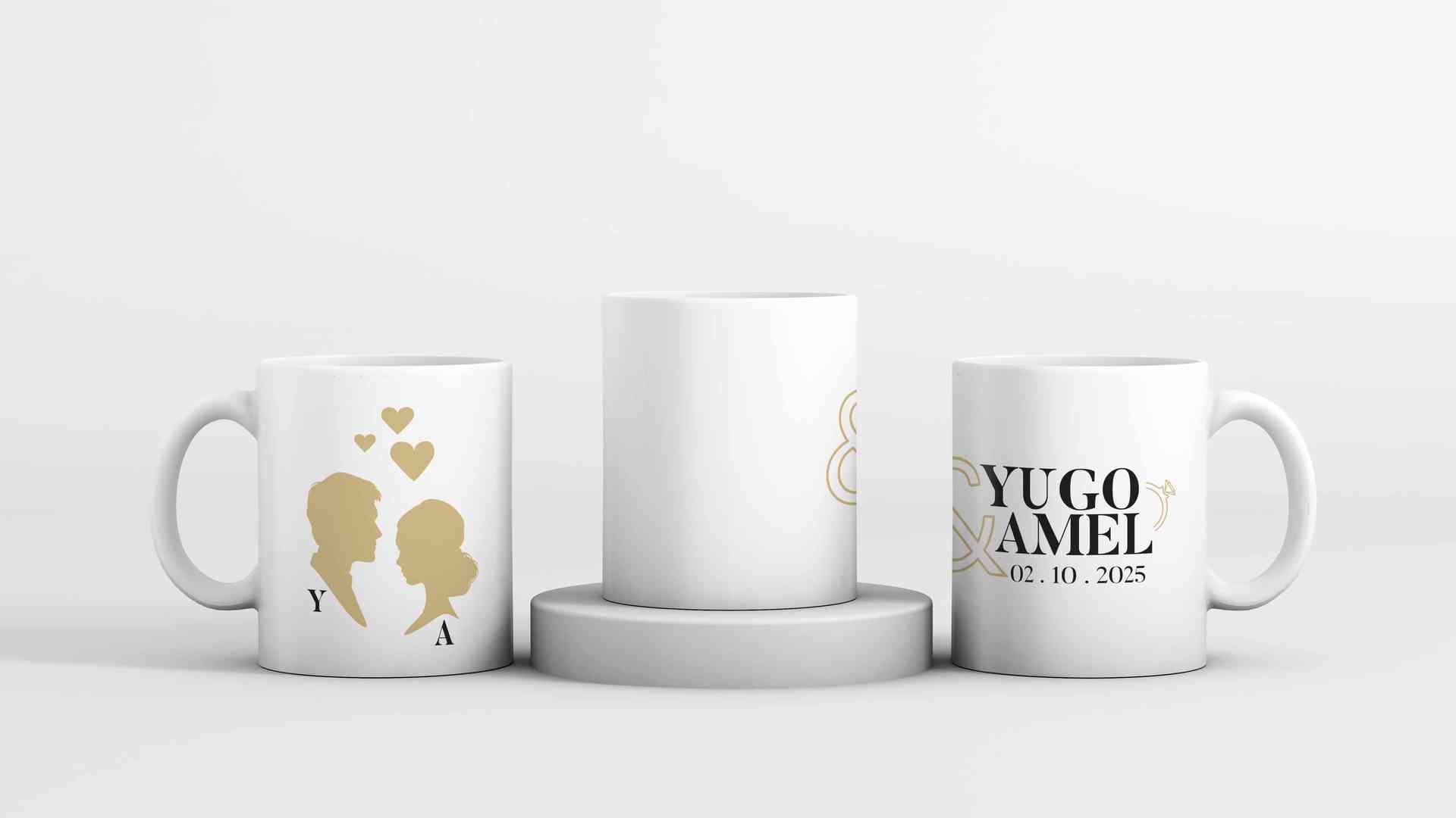 Desain mug ini bertemakan romantis dan elegan, cocok sebagai souvenir pernikahan atau hadiah spesial bagi pasangan. Mug ini memiliki tampilan minimali...