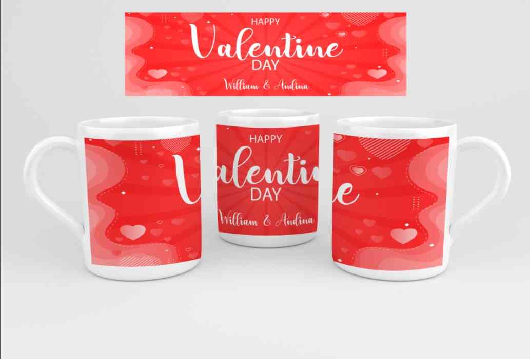 Mug Valentine ini memiliki desain yang manis dan penuh kasih, menampilkan ilustrasi kartun pasangan pria dan wanita yang sedang berdampingan dengan penuh kehangatan. Karakter-karakter tersebut digambar dengan gaya yang ceria dan penuh ekspresi cinta, menciptakan kesan romantis yang menyentuh hati. Di bagian kanan mug, terdapat tulisan "Happy Valentine" yang ditulis dengan font yang lembut dan elegan, menyuarakan kebahagiaan di hari spesial ini. Di bawahnya, terdapat nama pasangan yang bisa disesuaikan, memberikan sentuhan personal yang menjadikan mug ini semakin istimewa. Desain ini sangat cocok untuk pasangan yang ingin merayakan Hari Valentine dengan cara yang unik dan penuh makna. Mug ini tidak hanya memberikan kehangatan saat menikmati minuman, tetapi juga menjadi simbol cinta yang abadi.