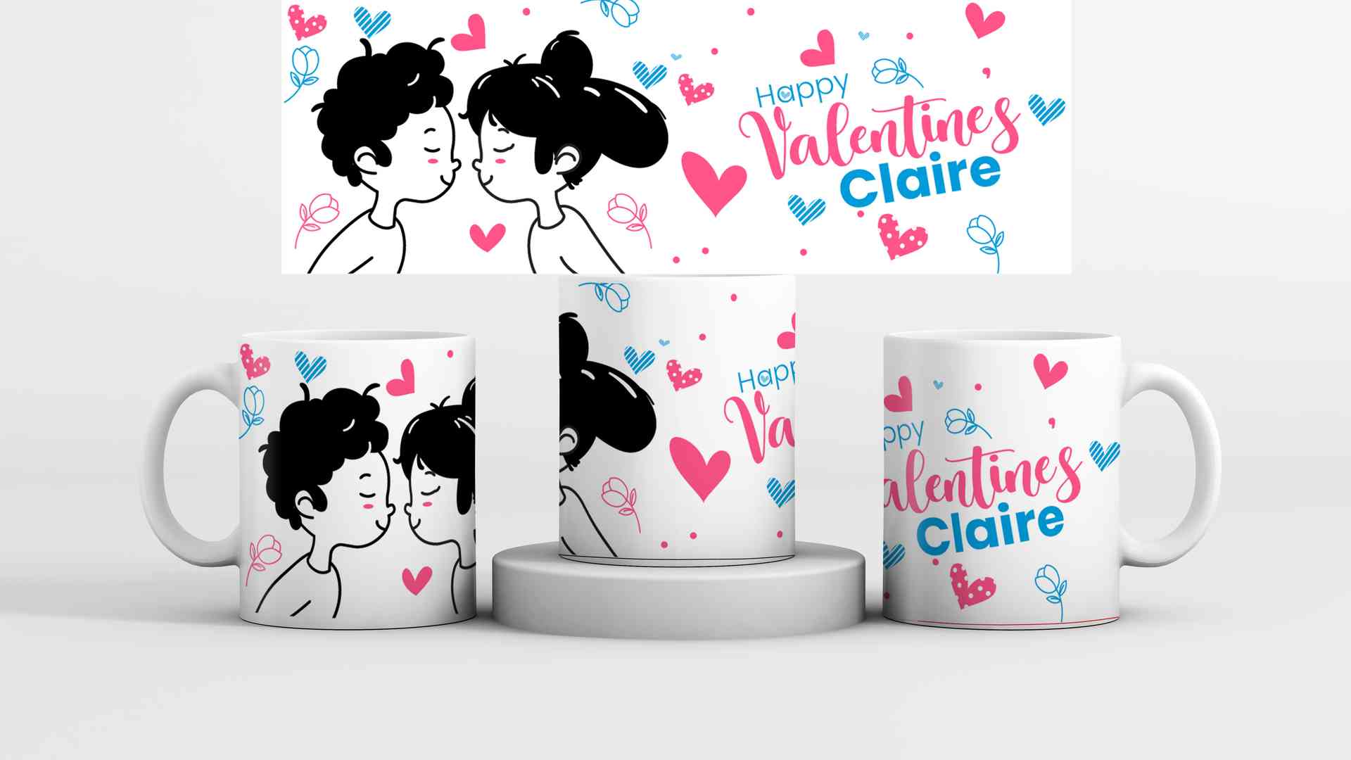Gambar ini menampilkan tiga cangkir atau mug dengan desain bertema cinta, yang disusun dalam tampilan mockup. Berikut adalah deskripsi rinci dari desa...