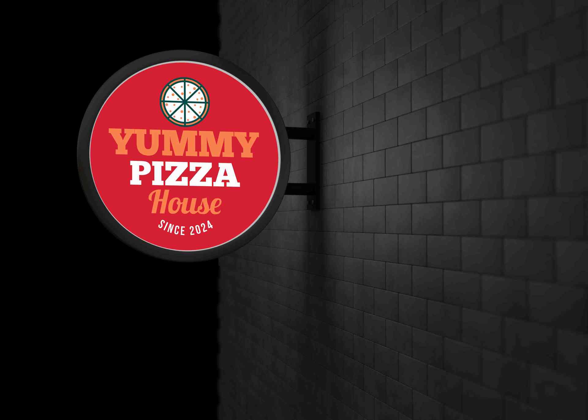 Neon box bulat ini menampilkan branding Yummy Pizza House dengan desain dominan warna merah yang kuat, menciptakan kesan berani, eye-catching, dan mud...