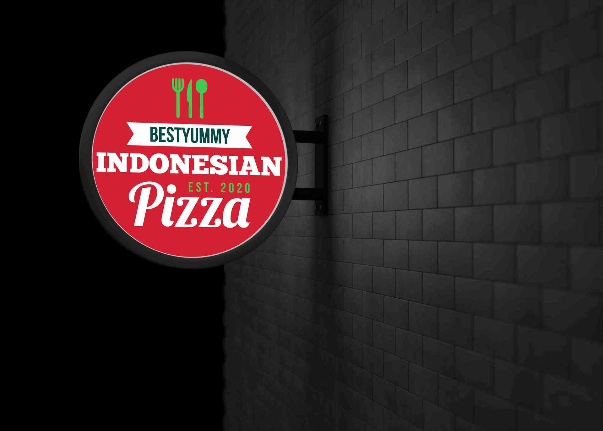 Neon box bulat ini menghadirkan branding Best Yummy Indonesian Pizza dengan desain latar merah tegas yang menonjolkan identitas khas Indonesia dan mud...