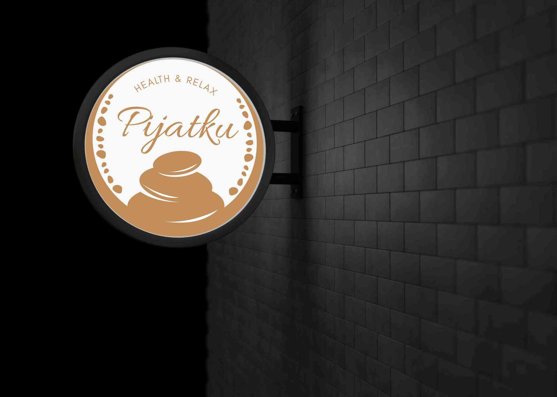 Neon box bulat dengan warna coklat dominan menampilkan teks “Pijatku” beraksen kaligrafi dan slogan “Health & Relax”, lengkap dengan ilustrasi bat...