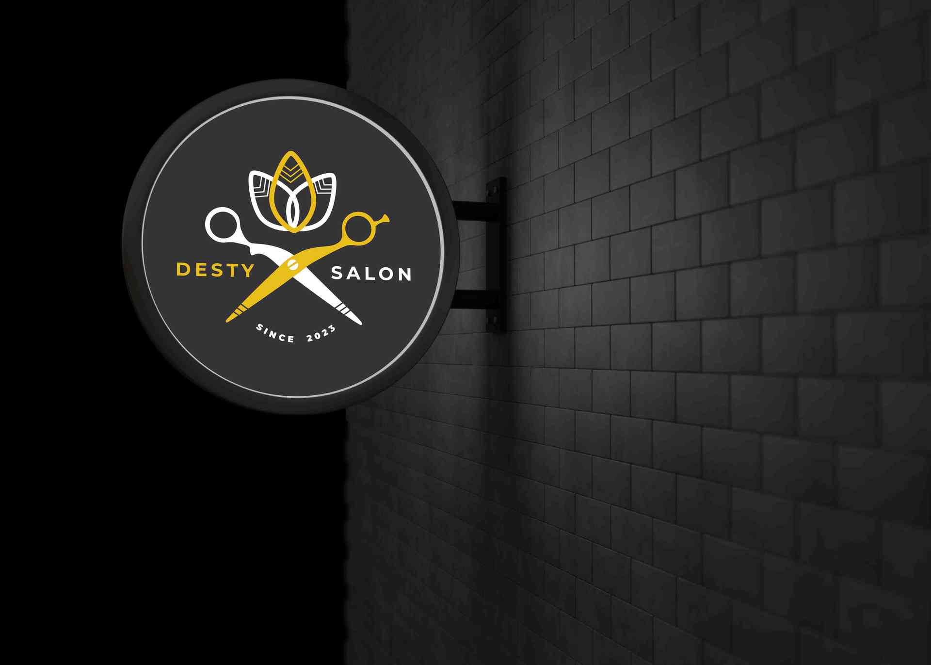 Neon box bulat ini menampilkan desain logo Desty Salon yang menawan dengan kombinasi simbol gunting dan bunga. Warna kuning emas pada gunting dan bung...