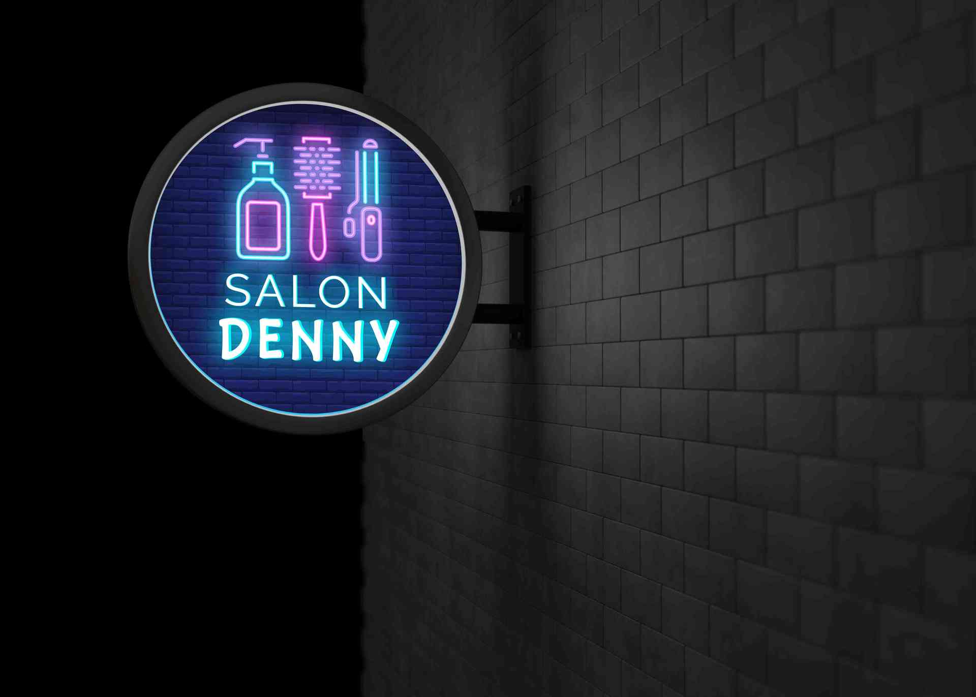 Desain neon box bulat ini menampilkan branding Salon Denny dengan gaya neon modern yang memikat mata. Terdapat ikon botol pump, sisir blow, dan catoka...
