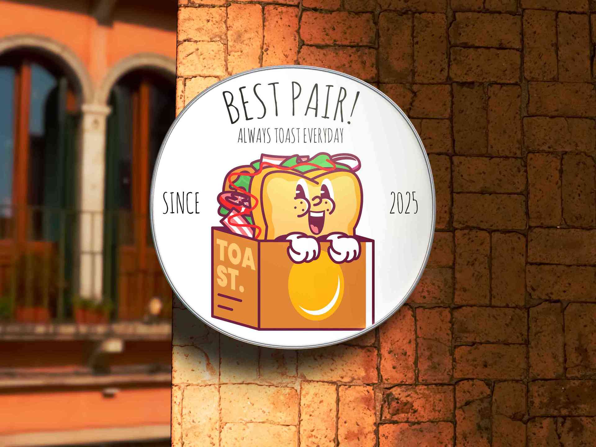 Desain neon box ini menghadirkan ilustrasi dua roti karakter lucu yang muncul dari dalam kemasan bertuliskan "TOAST", dilengkapi ekspresi wajah ceria...