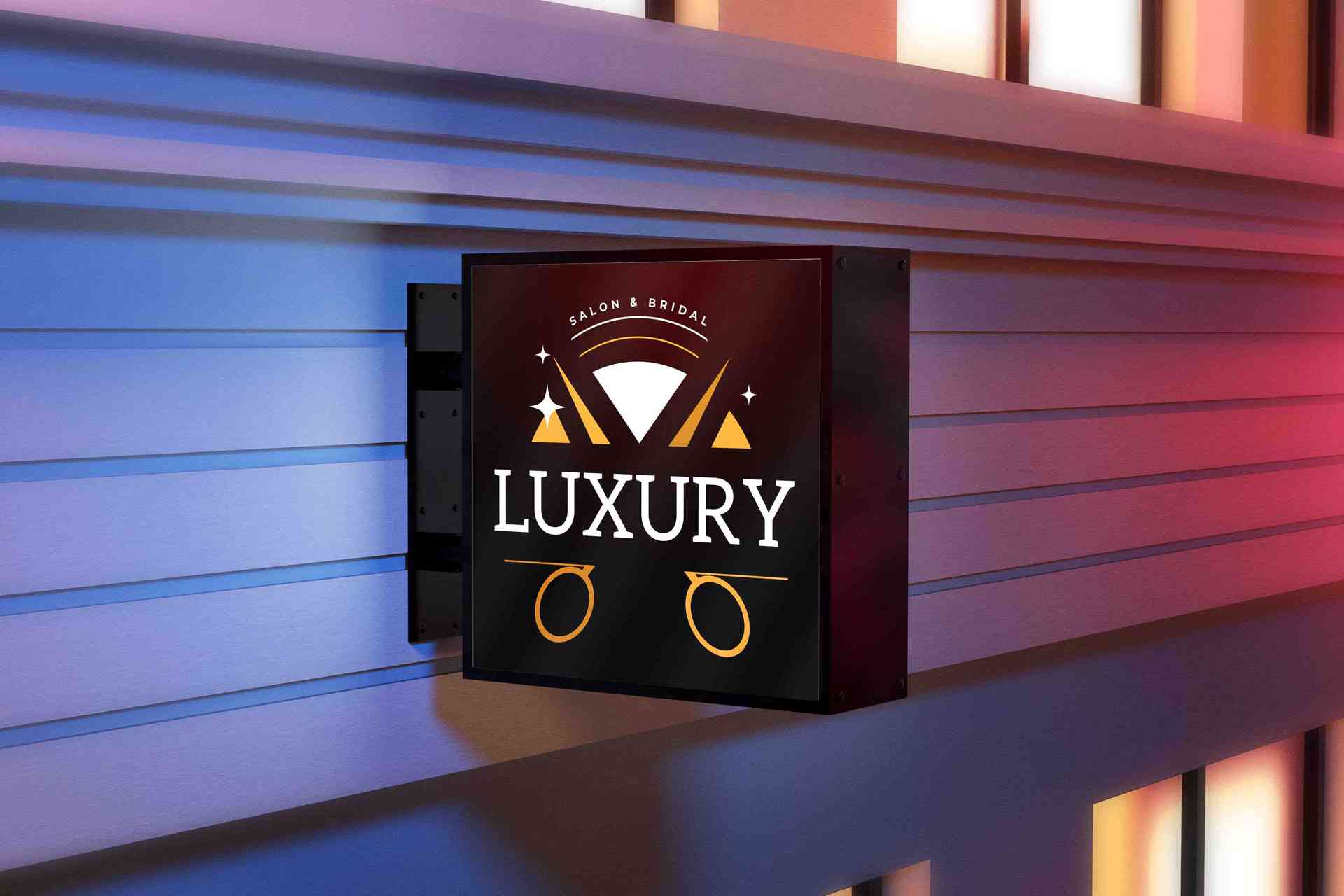 Neon box kotak ini menampilkan desain logo Luxury yang elegan dengan tulisan kapital putih tegas, dipadukan ornamen geometris berwarna emas dan putih...