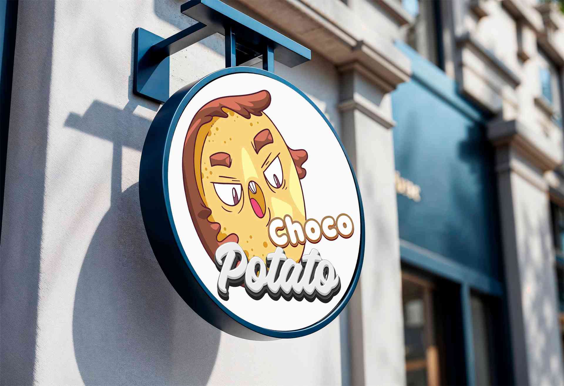 Neon box ini menghadirkan karakter kentang dengan topping cokelat dan ekspresi wajah yang jenaka. Tulisan 'Choco Potato' tampil dengan kontras huruf l...