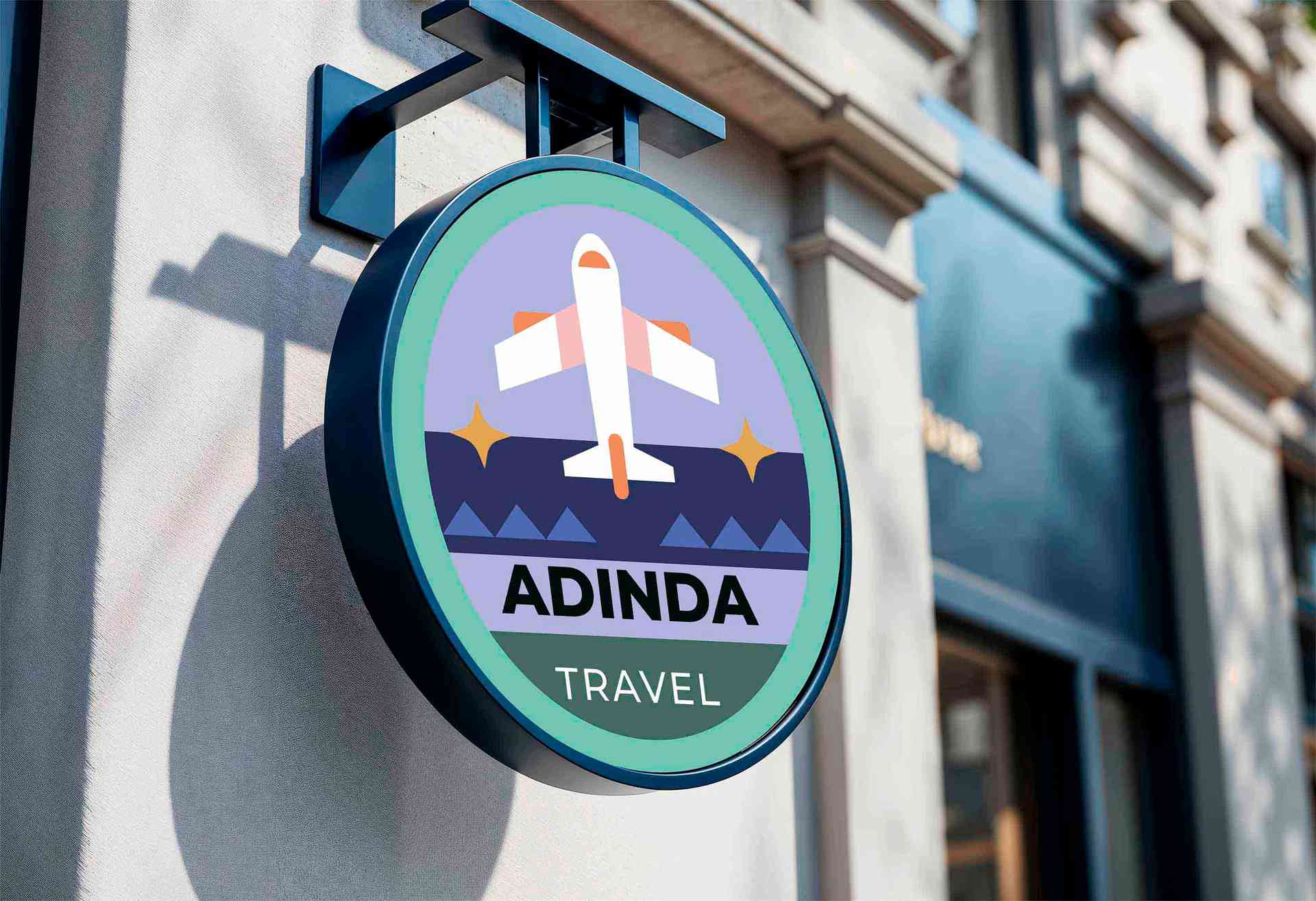 Neon box Adinda Travel menampilkan logo pesawat terbang dengan latar langit dan bintang, mencerminkan layanan travel profesional dan ramah. Perpaduan...