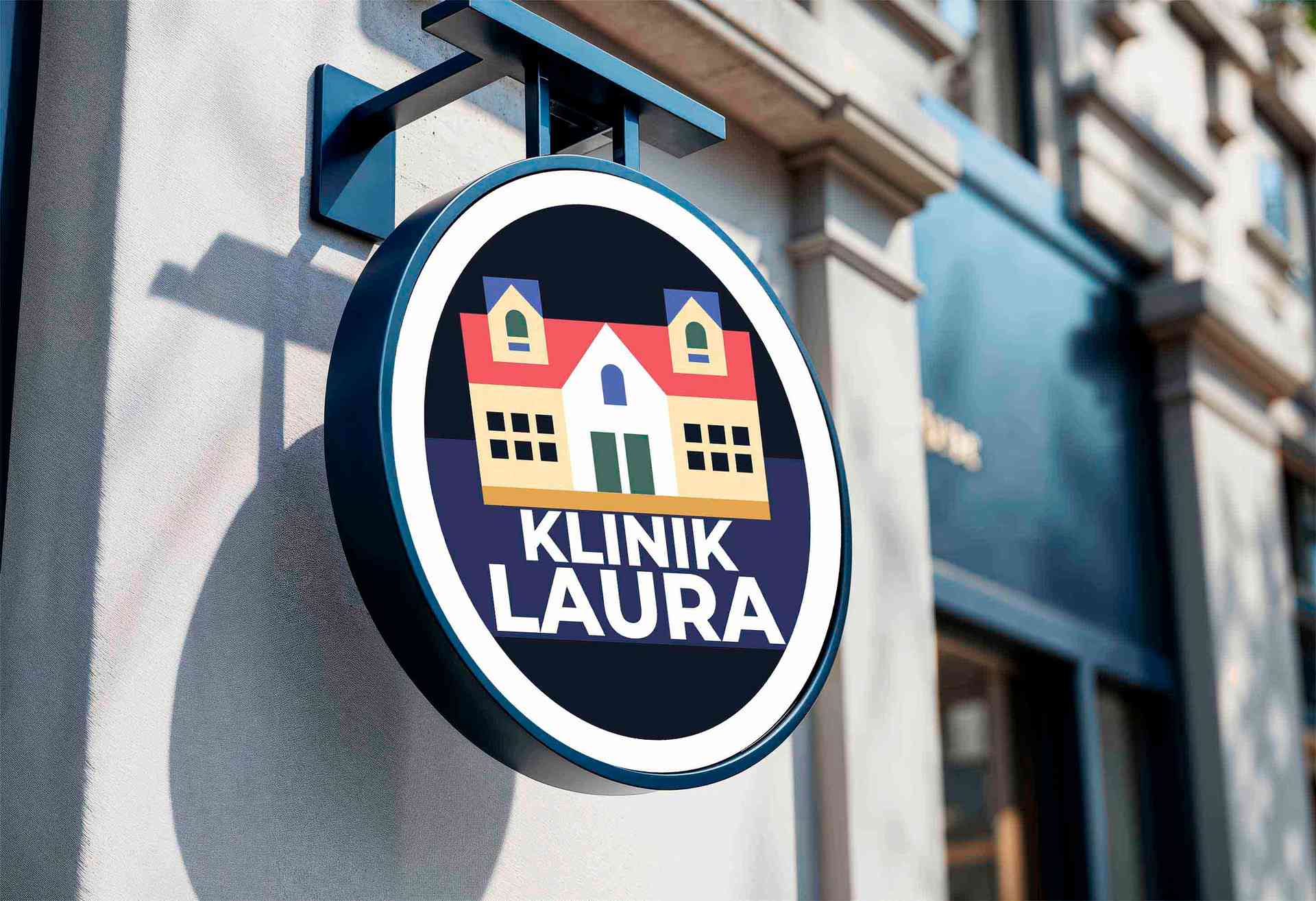 Neon box Klinik Laura menonjolkan ilustrasi gedung klinik berwarna cerah dengan desain minimalis dan profesional. Desain ini menggambarkan layanan kes...