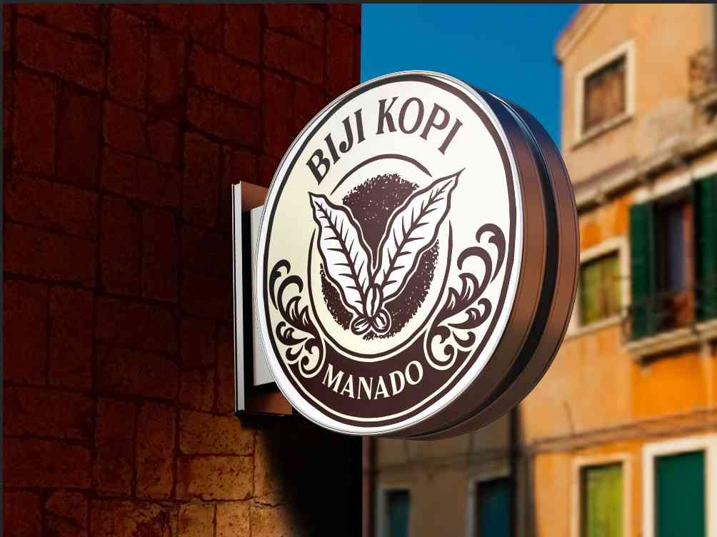 Desain Neon Sign Box ini mengusung gaya tradisional dengan nuansa khas daerah, menampilkan ilustrasi dua daun kopi dan biji yang menyatu di tengah, se...