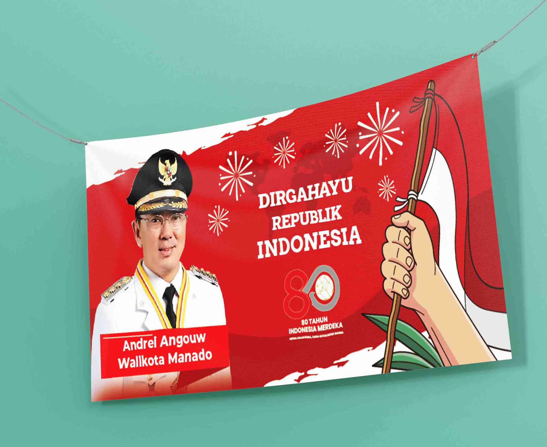Baliho bertema kemerdekaan ini didesain dengan warna dominan putih dan merah, menampilkan visual utama berupa bendera merah putih dan logo 80 tahun In...