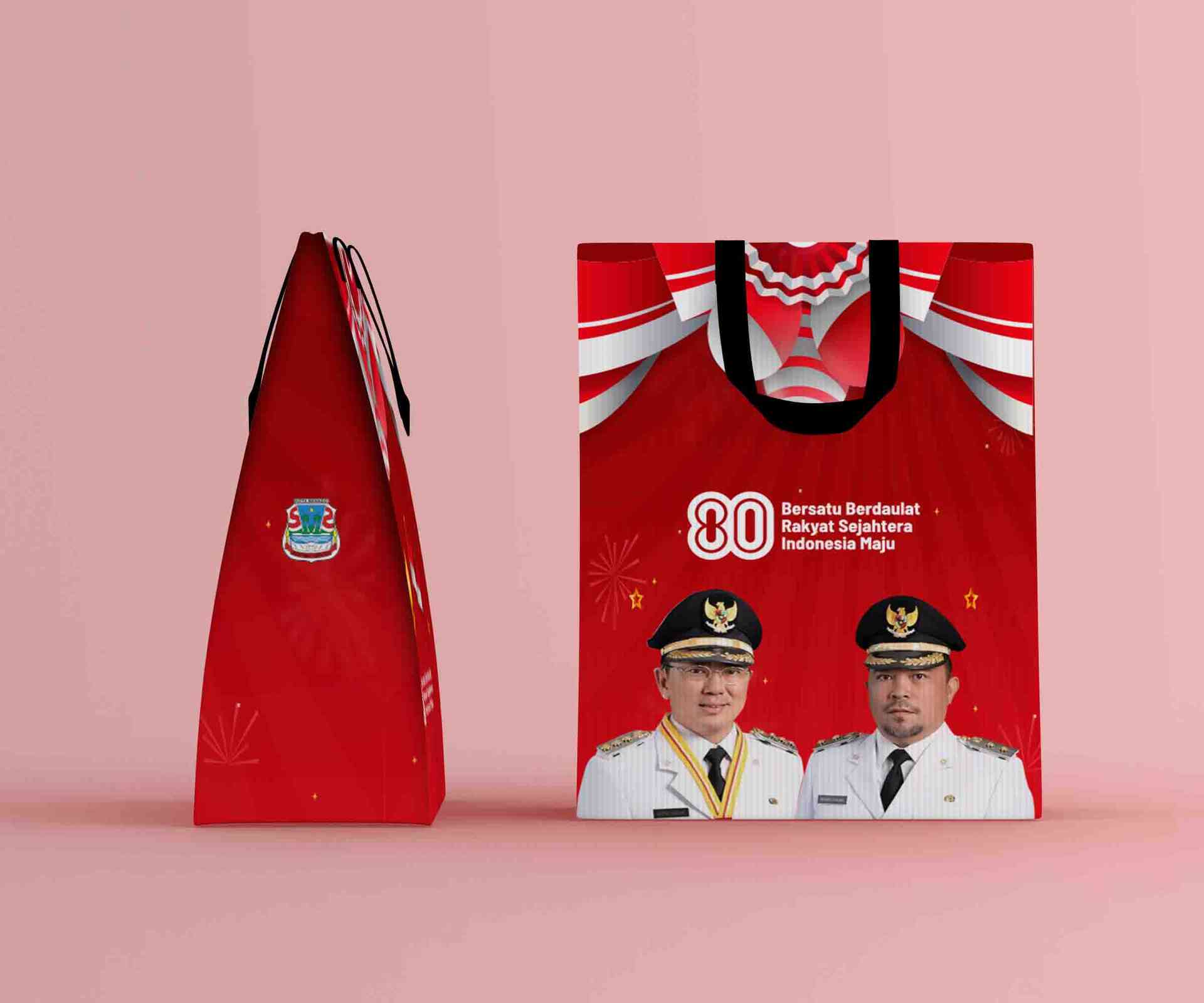 Paper bag perayaan HUT RI ke-80 mengusung bentuk persegi dengan desain visual dominan merah dan putih, menonjolkan peta Indonesia berwarna putih pada...