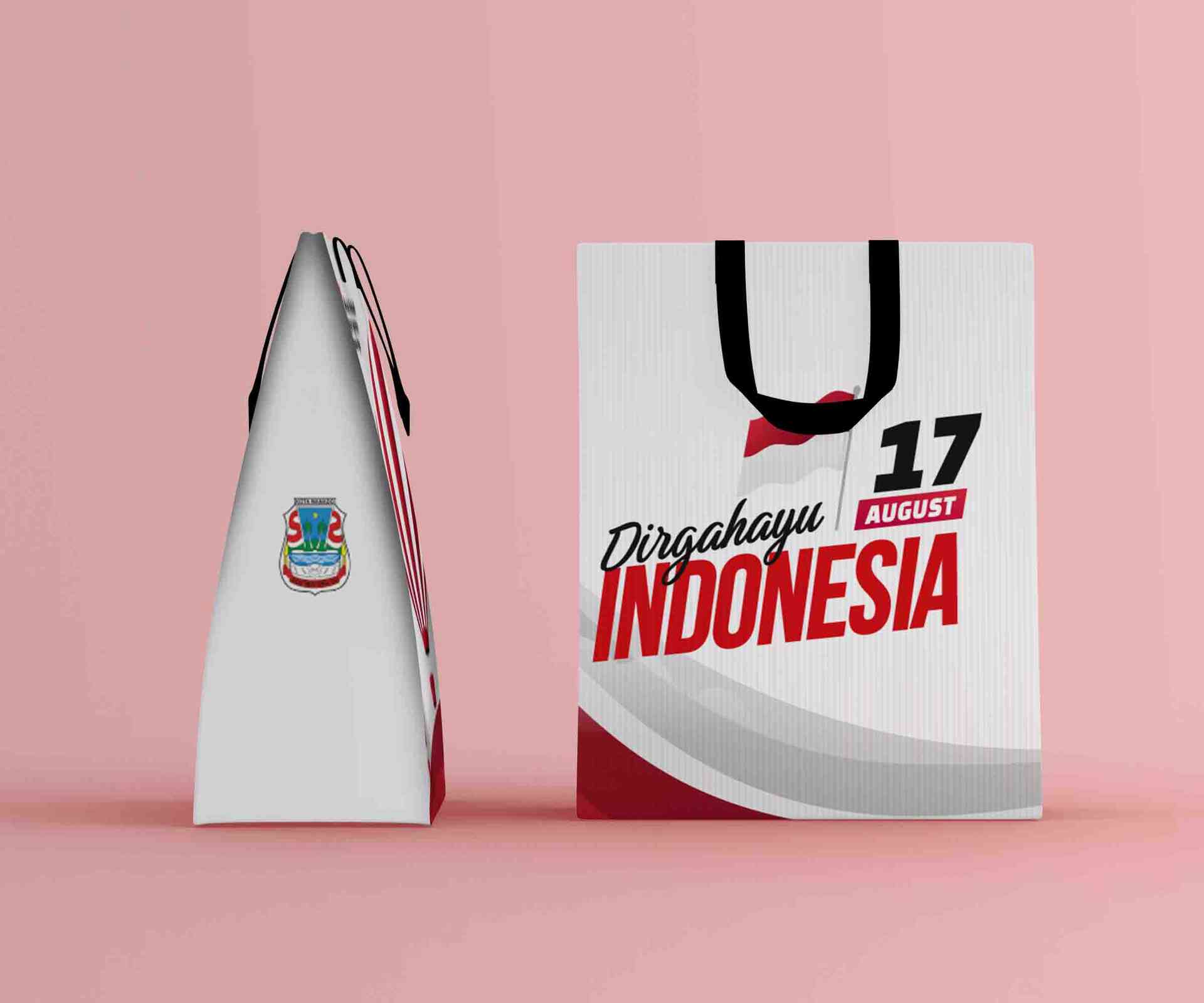 Paper bag edisi spesial HUT ke-80 Republik Indonesia ini berbentuk persegi panjang dengan desain visual yang dominan merah dan putih, merepresentasika...