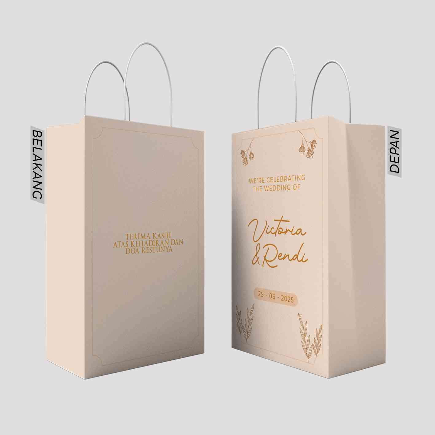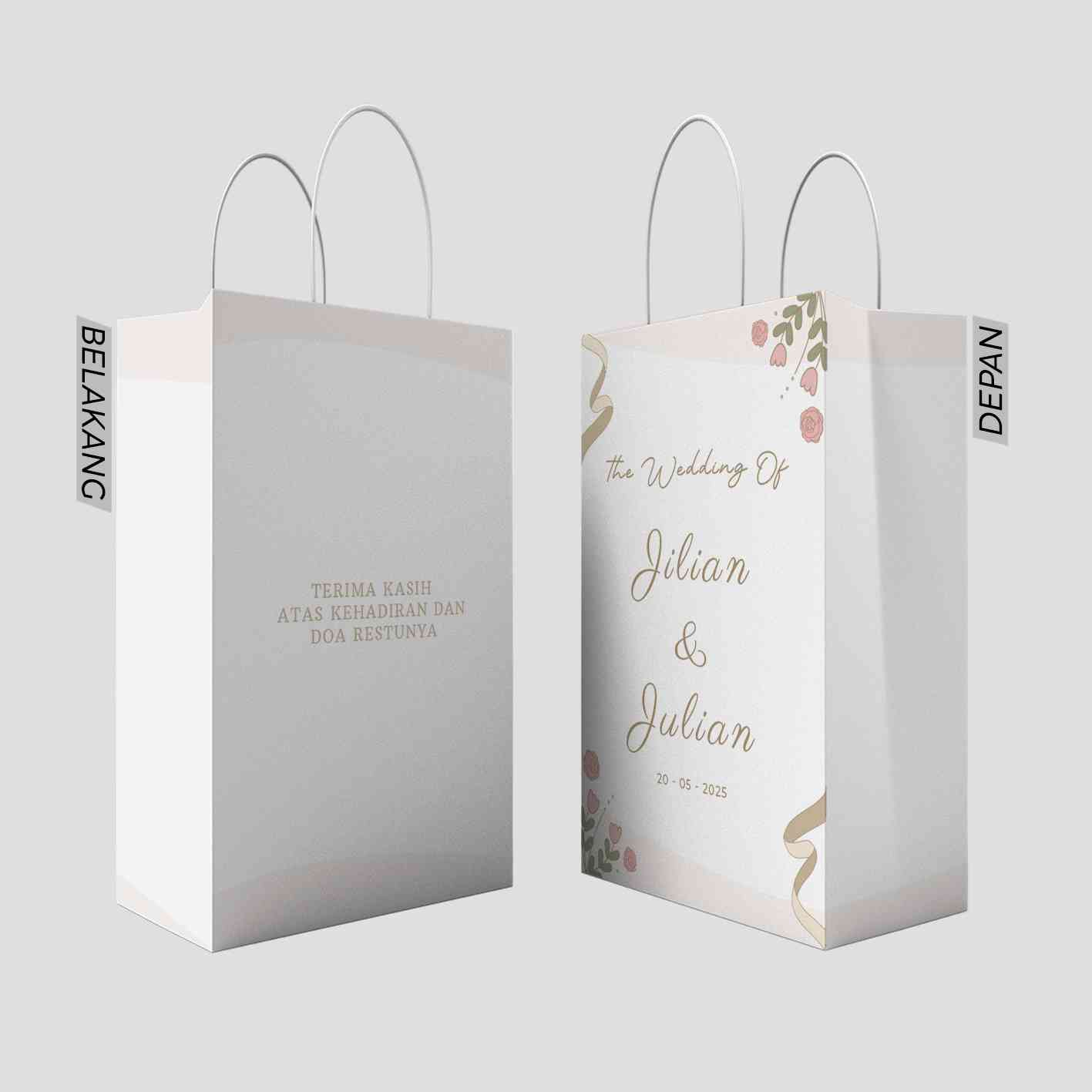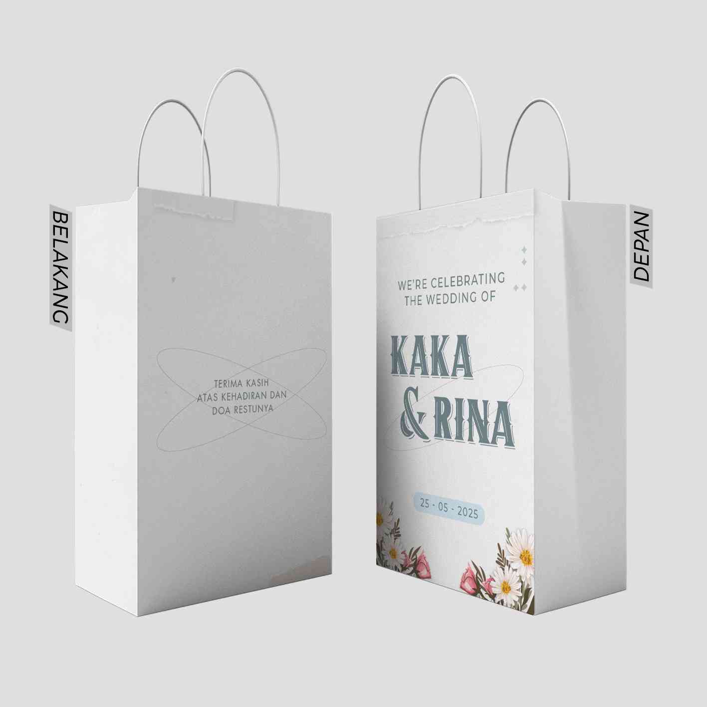 Paper bag putih yang cantik ini dihiasi dengan desain bunga pastel yang lembut, memberikan kesan alami dan romantis. Bunga-bunga yang menghiasi paper bag ini menambah kesan segar dan hidup, sangat cocok untuk pernikahan dengan tema musim semi atau bunga. Nama pasangan pengantin tercetak dengan font modern yang serasi di bagian depan paper bag, sementara tanggal pernikahan yang terletak di bawahnya memberikan informasi yang jelas. Di bagian belakang paper bag, terdapat ucapan terima kasih yang ditulis dengan font kecil yang tetap elegan dan penuh penghargaan. Paper bag ini cocok untuk pasangan yang menginginkan pernikahan dengan nuansa alami dan romantis, di mana setiap detail memberikan kesan kehangatan dan kebahagiaan.
