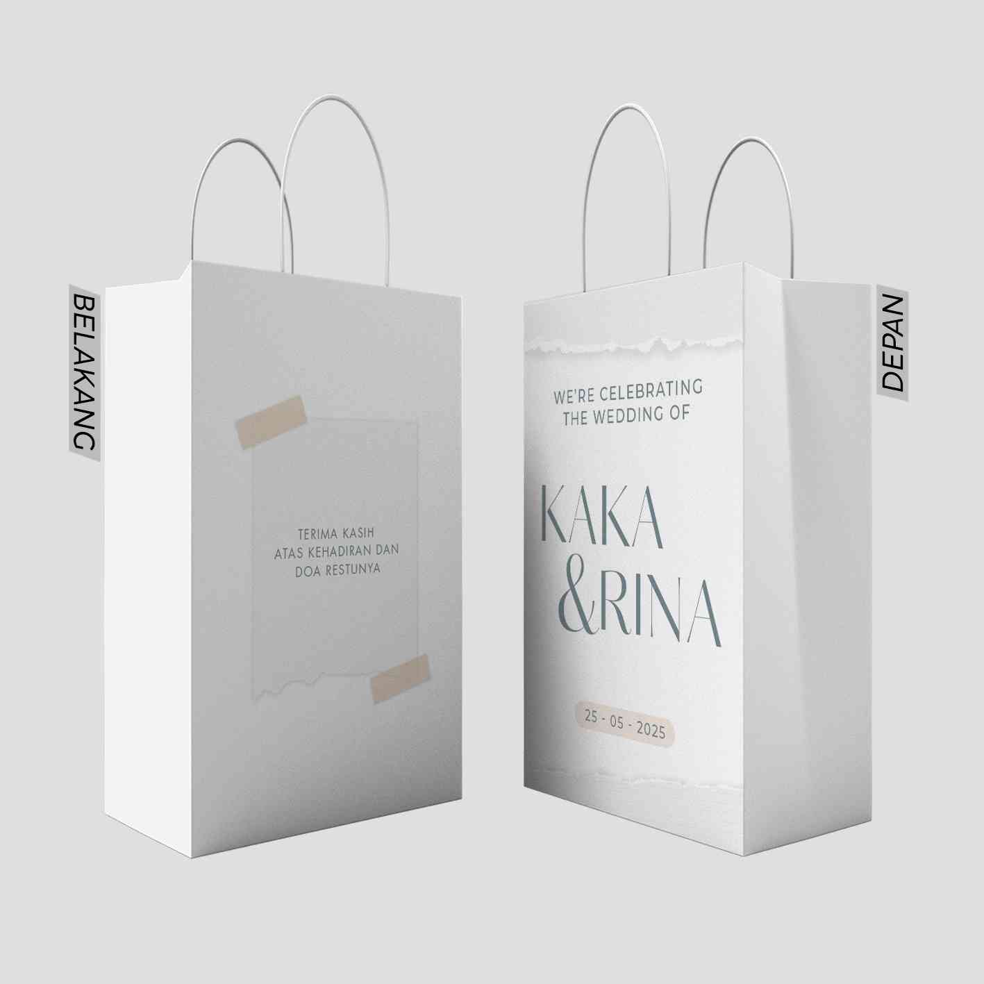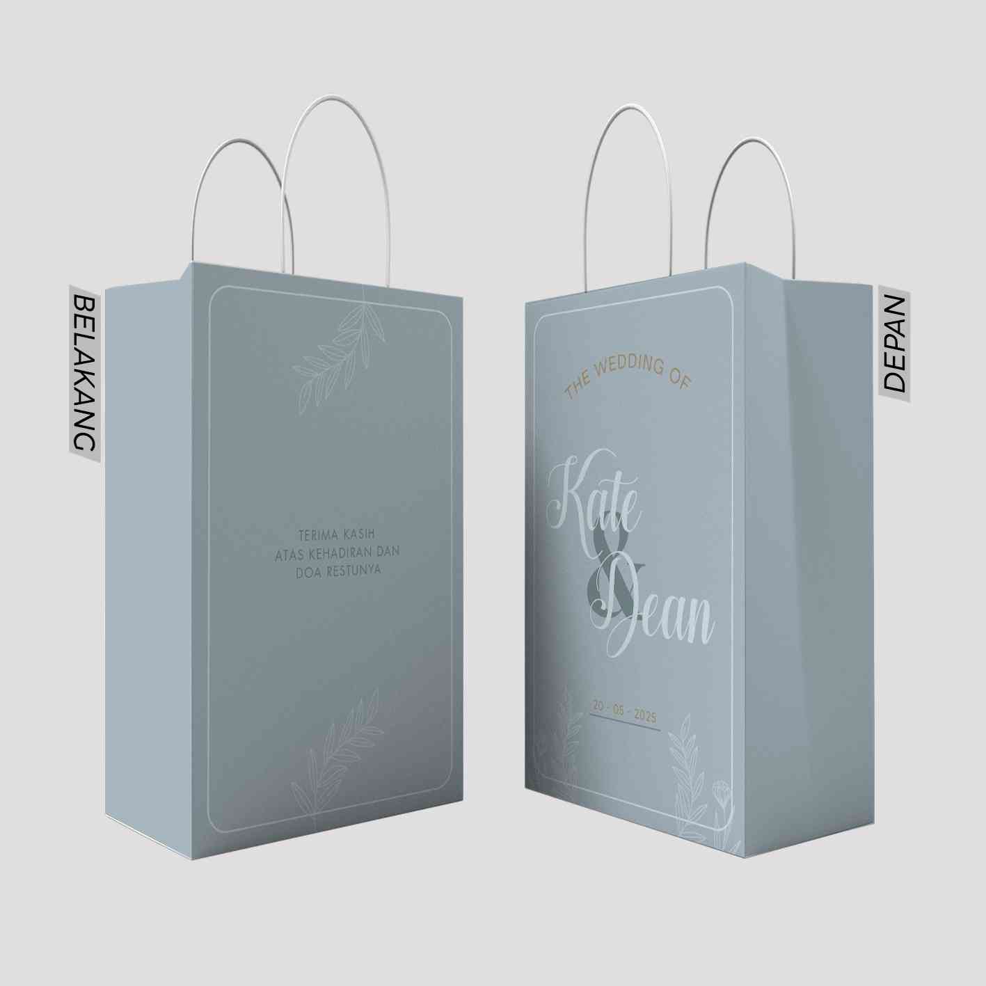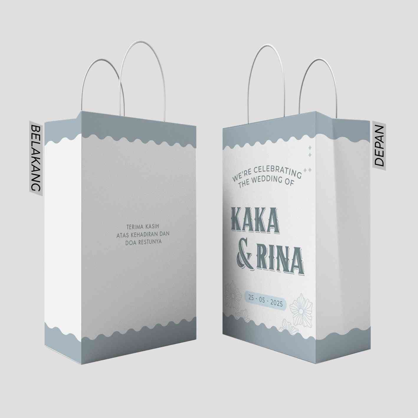 Paper bag putih yang cantik ini dihiasi dengan desain bunga pastel yang lembut, memberikan kesan alami dan romantis. Bunga-bunga yang menghiasi paper bag ini menambah kesan segar dan hidup, sangat cocok untuk pernikahan dengan tema musim semi atau bunga. Nama pasangan pengantin tercetak dengan font modern yang serasi di bagian depan paper bag, sementara tanggal pernikahan yang terletak di bawahnya memberikan informasi yang jelas. Di bagian belakang paper bag, terdapat ucapan terima kasih yang ditulis dengan font kecil yang tetap elegan dan penuh penghargaan. Paper bag ini cocok untuk pasangan yang menginginkan pernikahan dengan nuansa alami dan romantis, di mana setiap detail memberikan kesan kehangatan dan kebahagiaan.