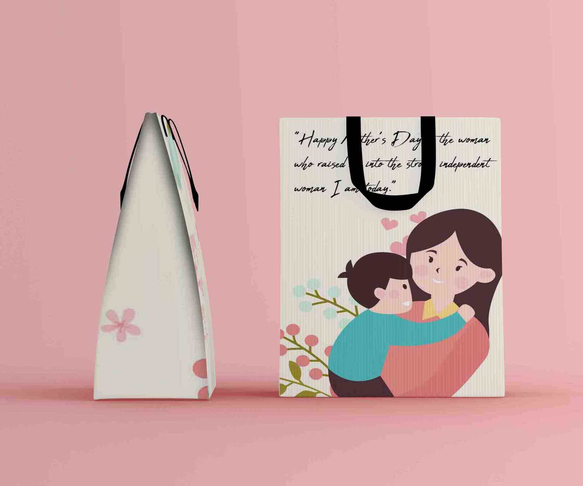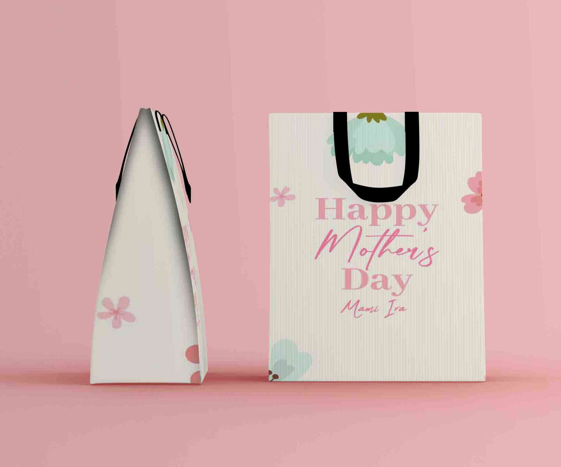 Paper bag ini didesain khusus untuk momen Hari Ibu, menampilkan pesan “Happy Mother’s Day” dengan font elegan yang dipersonalisasi dengan nama. Warna dasar krem lembut berpadu harmonis dengan aksen bunga pastel, menciptakan kesan hangat dan penuh kasih sayang. Di sisi belakang, terdapat ilustrasi ibu dan anak yang dipadukan dengan kutipan manis bertuliskan “Happy Mother’s Day to the woman who raised me into the strong, independent woman I am today,” menjadikan paper bag ini sangat personal dan bermakna. Desain ini cocok digunakan sebagai pembungkus kado spesial untuk ibu tercinta, menyampaikan cinta dan penghargaan dengan visual yang lembut dan emosional.