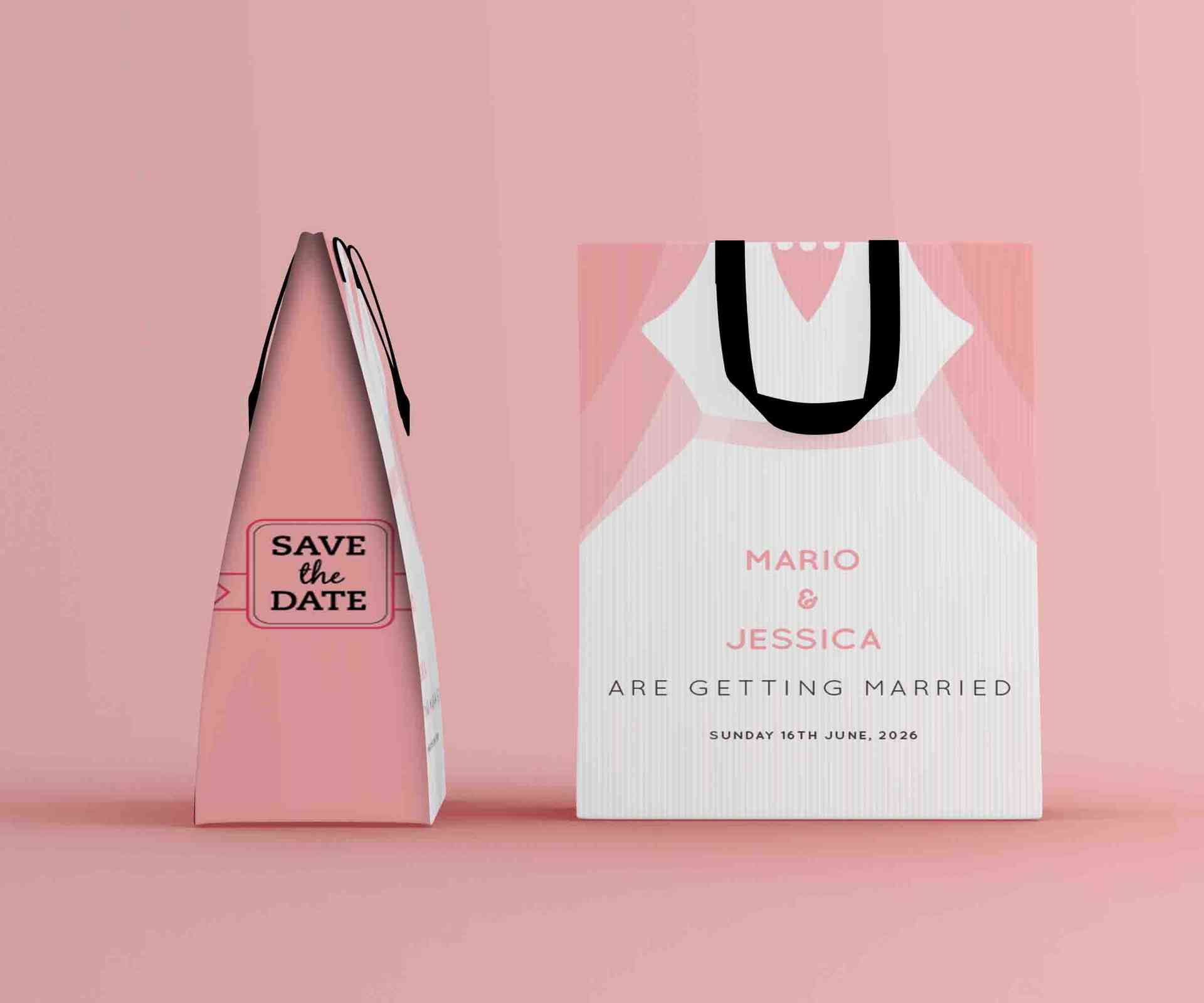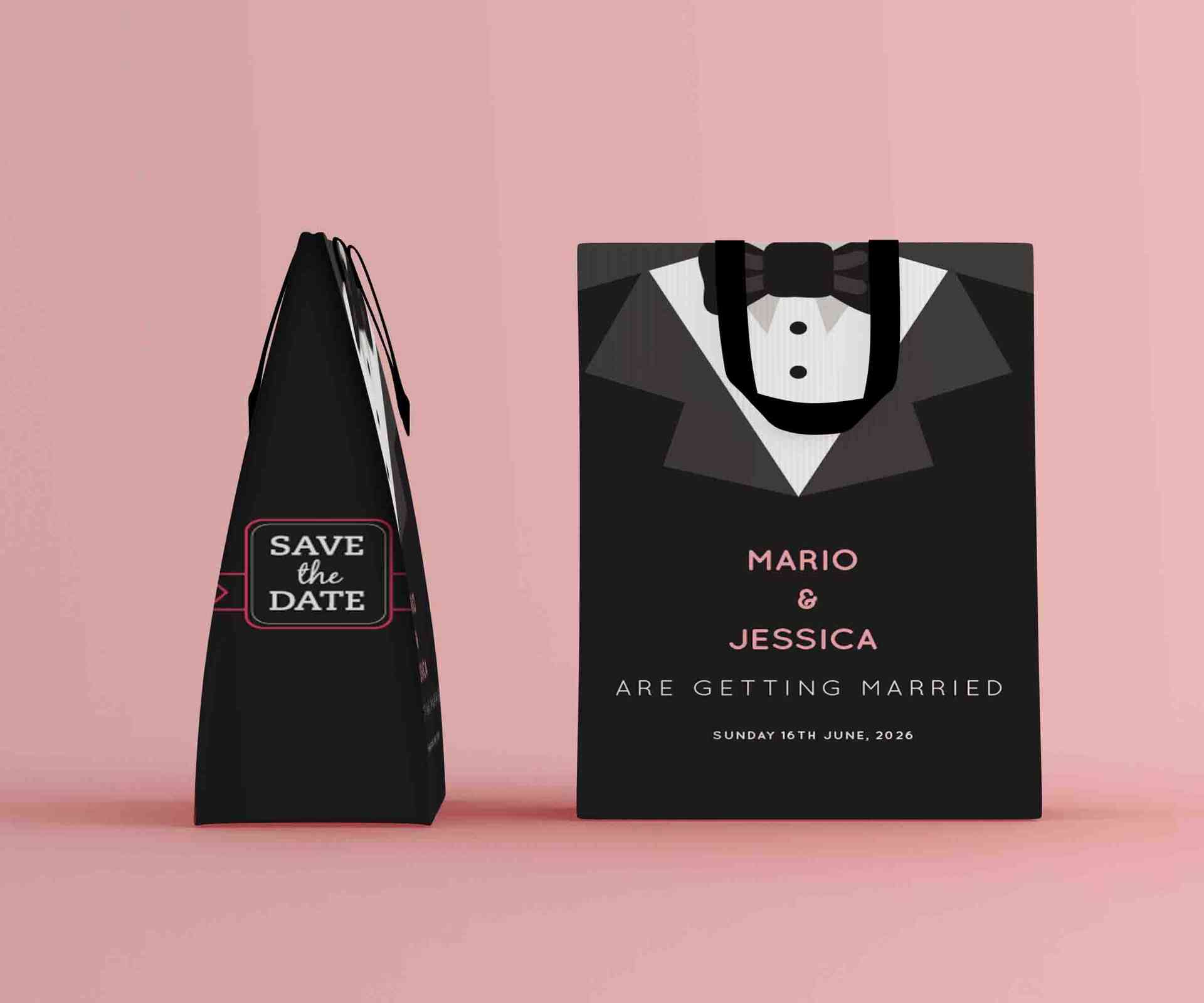 Paper bag ini dirancang spesial untuk momen pernikahan Mario dan Jessica dengan nuansa elegan dan modern. Sisi depan menampilkan ilustrasi gaun pengan...