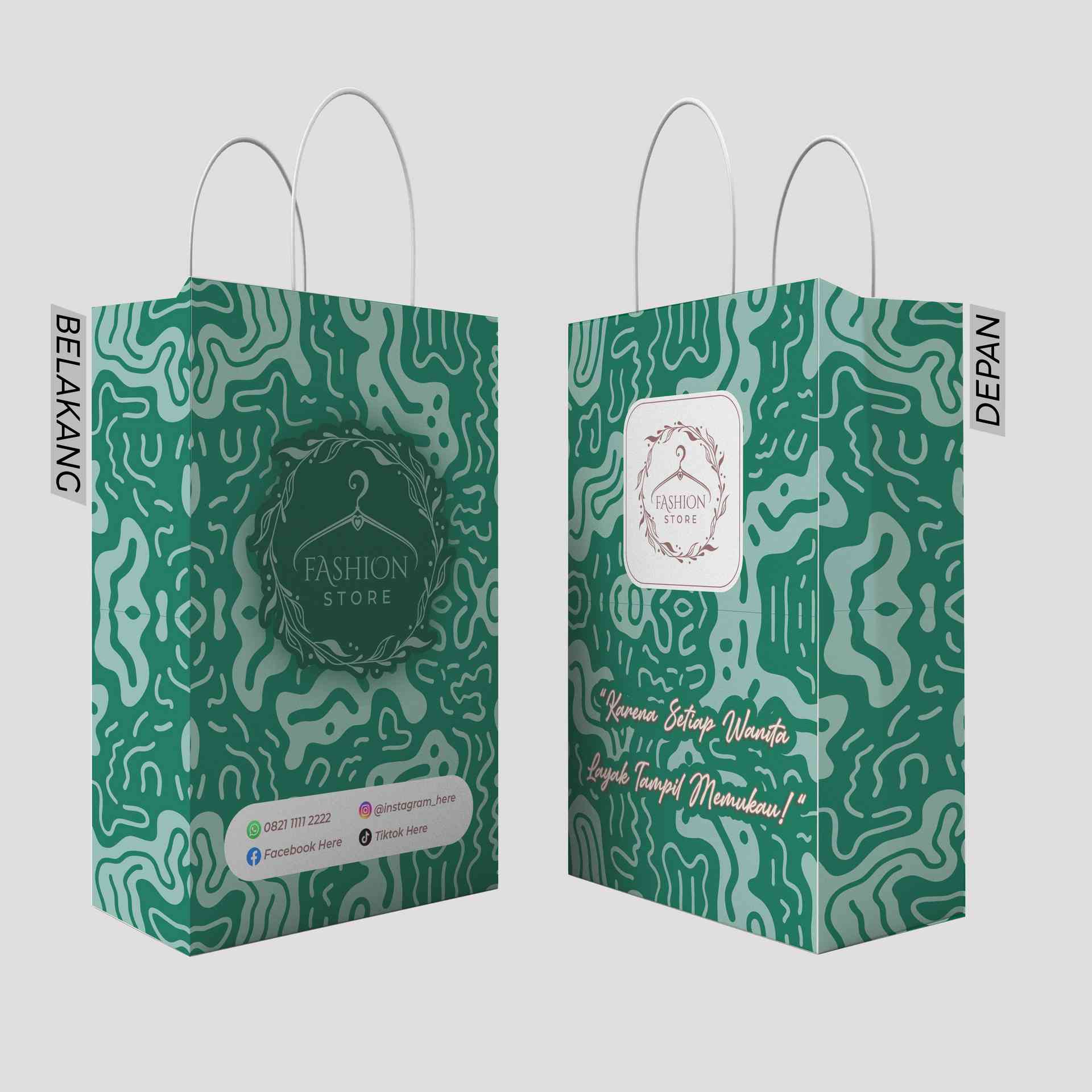 Gambar ini menampilkan desain paper bag eksklusif dari Fashion Store dengan nuansa hijau yang elegan dan modern. Pola abstrak yang menghiasi seluruh p...