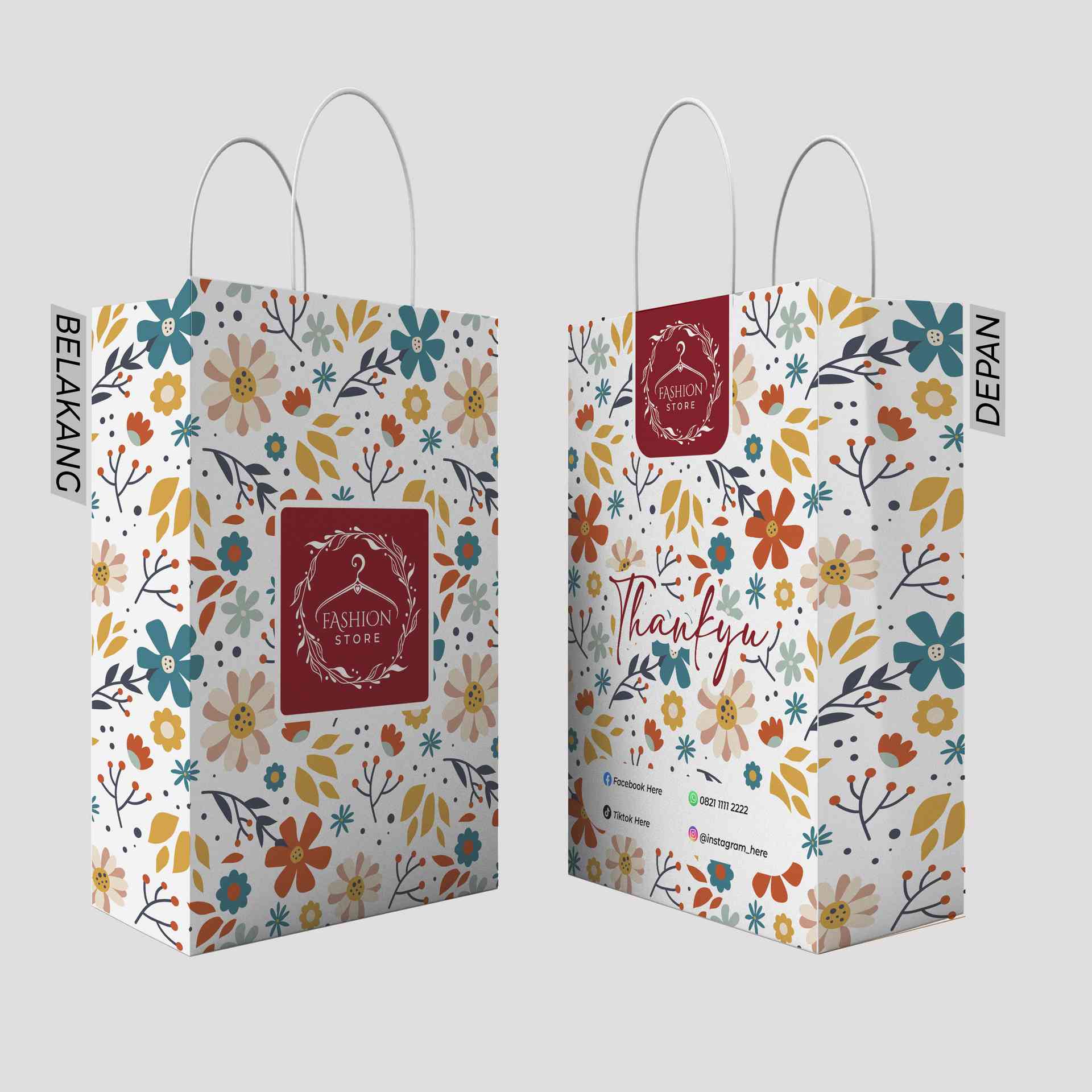 Gambar ini menampilkan desain paper bag eksklusif dari Fashion Store, yang mengusung warna putih dengan sentuhan cokelat elegan. Motif swirl halus di...