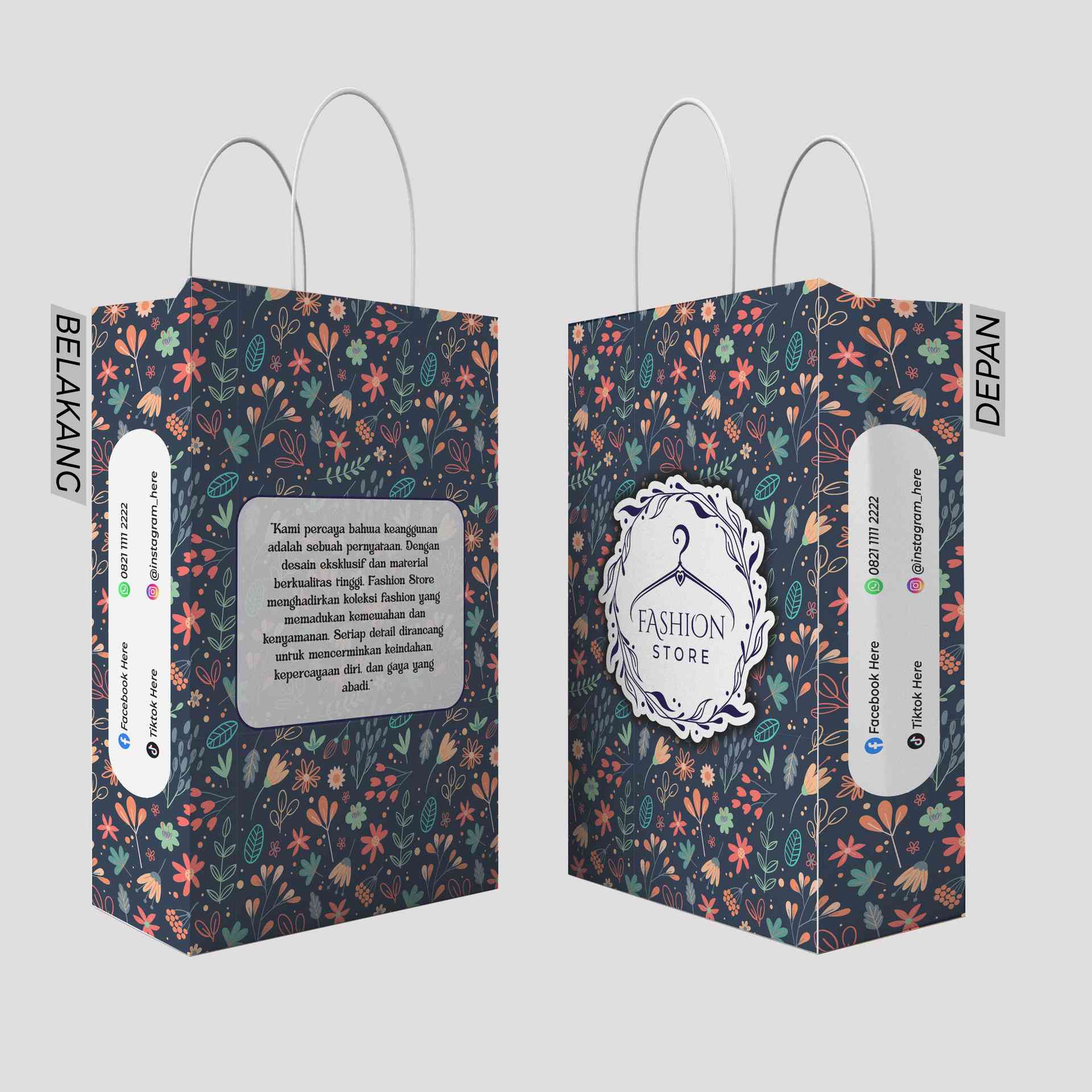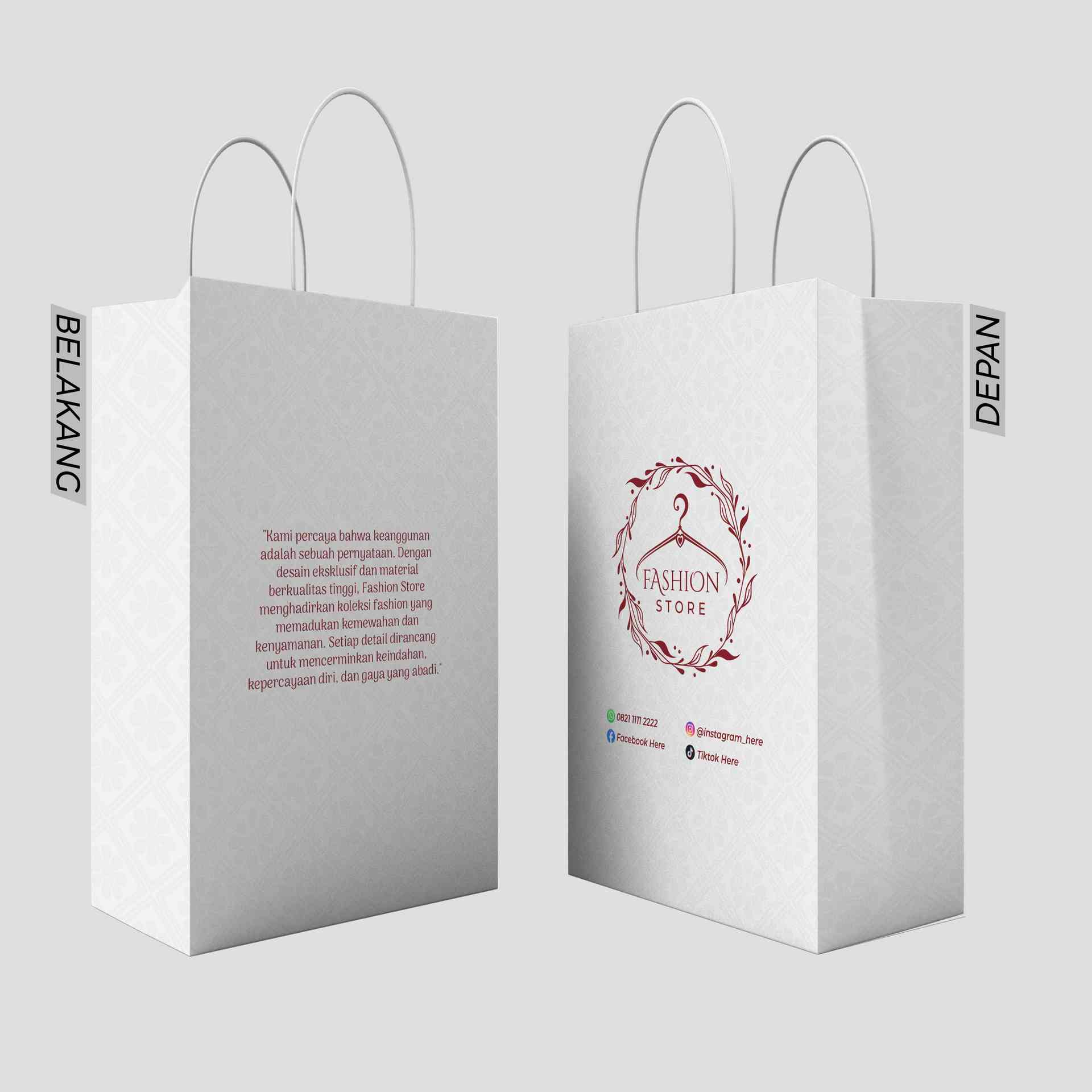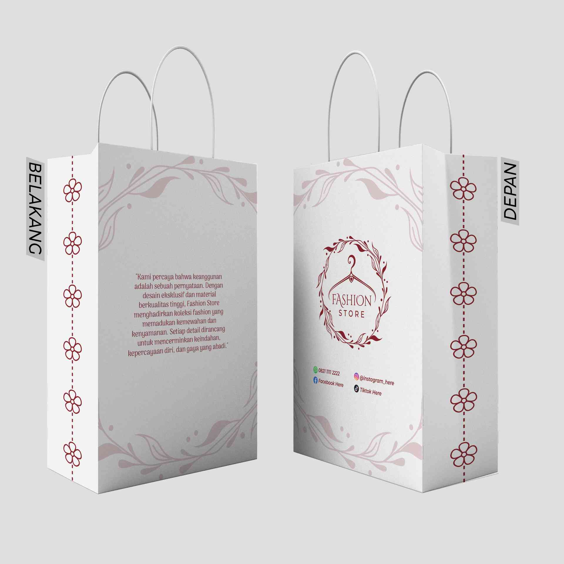 Gambar ini menampilkan desain paper bag eksklusif dari "Fashion Store" dengan tampilan minimalis dan elegan. Warna dasar putih dengan motif halus memb...