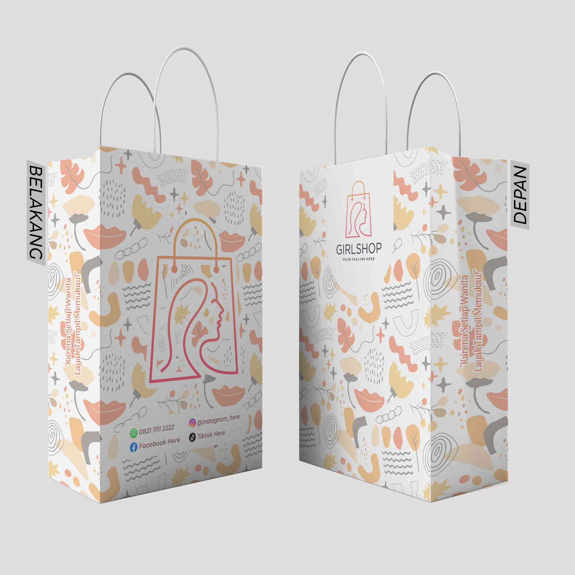 Gambar ini menampilkan desain paper bag eksklusif dari GIRLSHOP, dengan warna dasar putih dan pola abstrak bernuansa pastel, seperti krem, peach, dan...