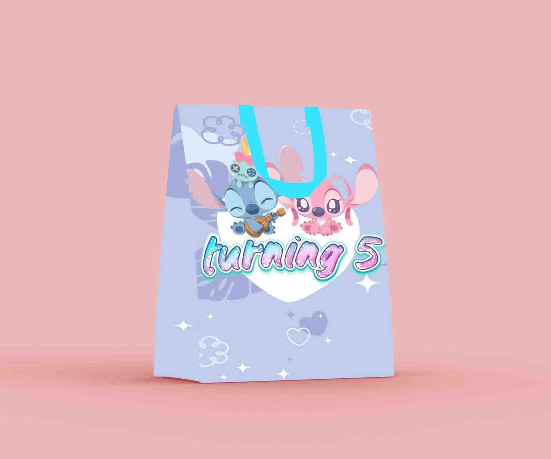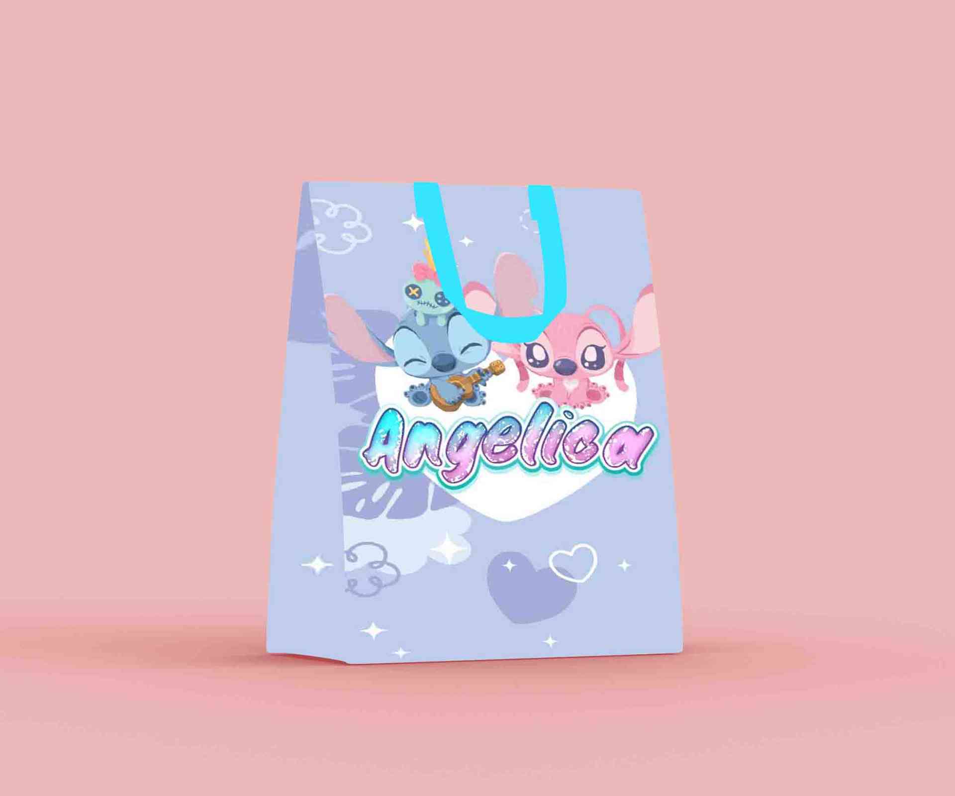 Desain paper bag ini menampilkan karakter Stitch dan Angel dalam gaya ilustrasi yang menggemaskan dan penuh warna pastel, cocok untuk suasana ulang ta...