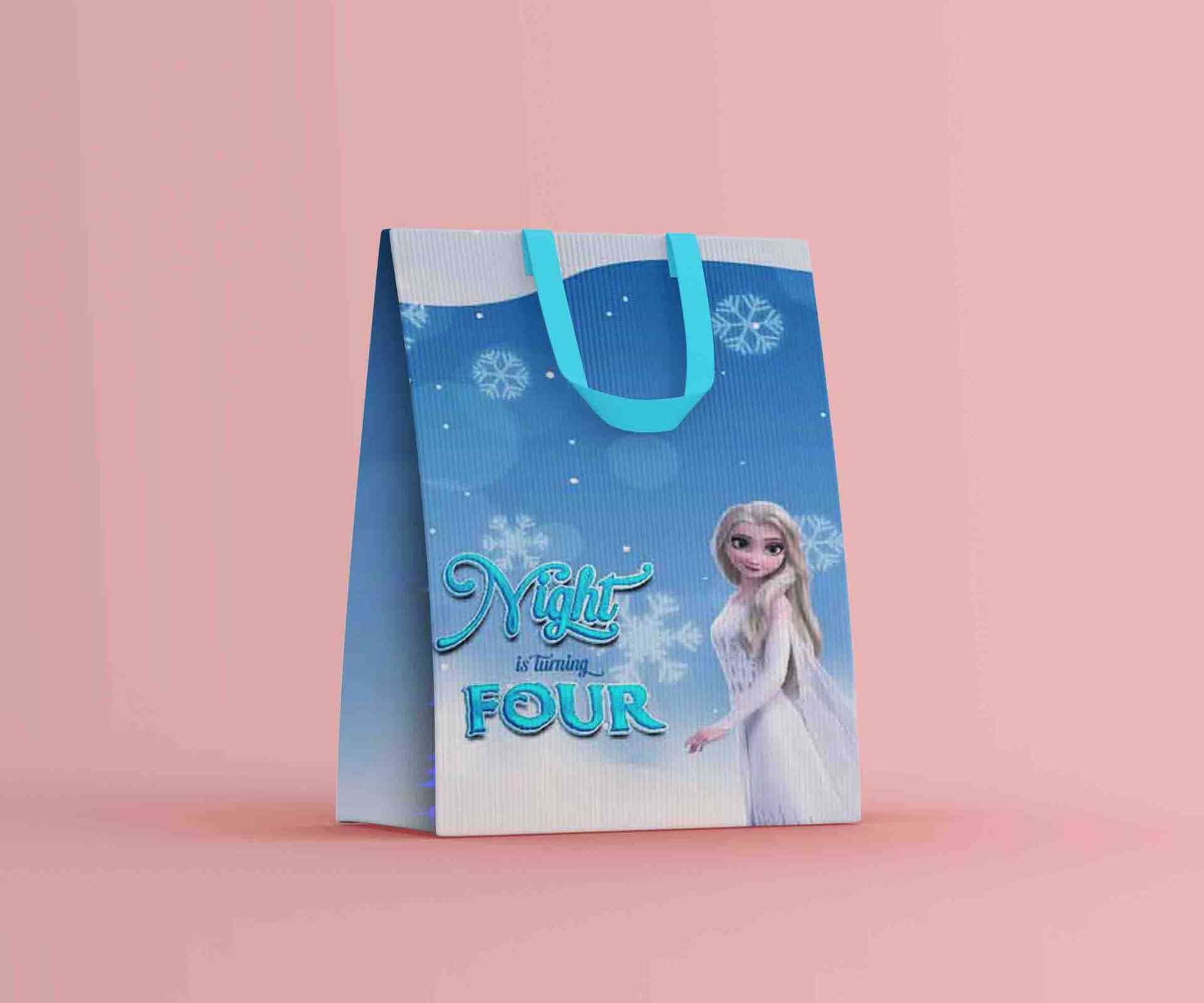 Paper bag ulang tahun ini hadir dengan desain magis bertema Frozen, menampilkan karakter Elsa dalam balutan gaun putih salju yang elegan. Di sisi kiri...