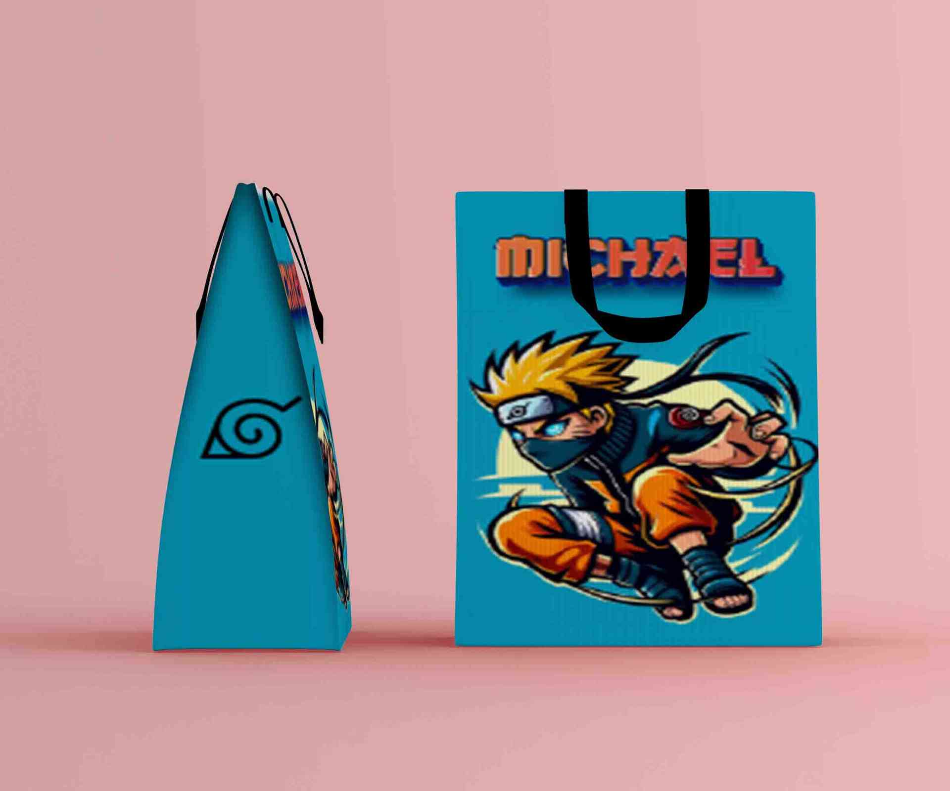 Paper bag ulang tahun ini mengusung tema Naruto Shippuden dengan ilustrasi karakter utama bergaya siluet kartun melakukan pose tangan khas ninjutsu, didominasi warna oranye, coklat, dan kuning yang dinamis. Nama dan usia anak tercetak mencolok dengan tipografi tebal serta efek warna gradien dan bayangan, menambah kesan energik dan personal. Desain visual berkarakter kuat ini menampilkan elemen swirl, bintang, dan latar berpola geometris, sehingga cocok digunakan sebagai kemasan souvenir acara ulang tahun anak, khususnya penggemar anime, dengan target pasar keluarga muda dan komunitas pecinta anime.