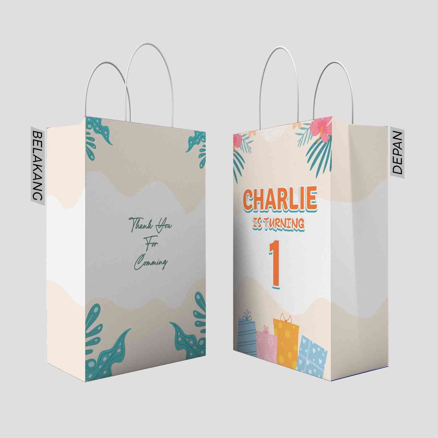 Tas kertas ulang tahun dengan desain tropis yang ceria dan penuh warna. Pada bagian depan tas terdapat tulisan "Charlie is turning 1" dan tanggal acar...