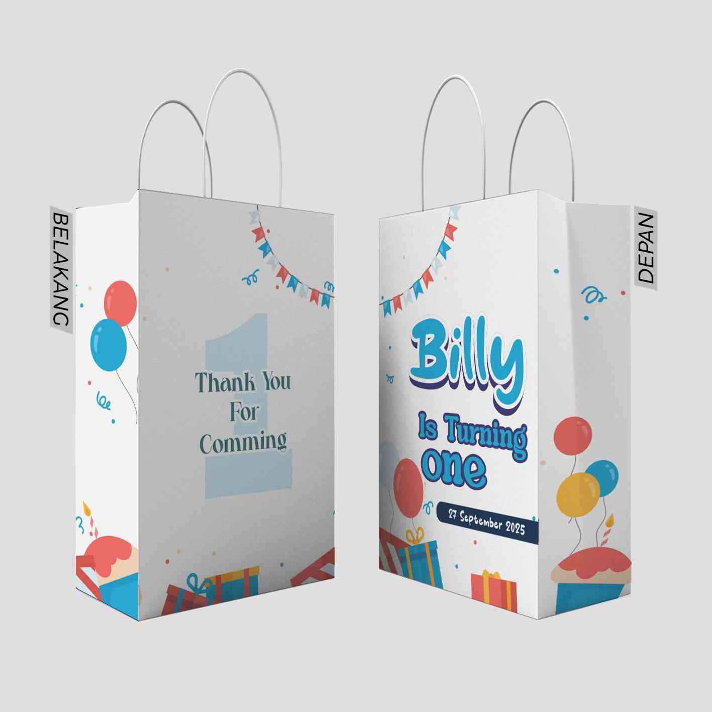 Tas kertas ulang tahun dengan desain ceria yang penuh warna. Di bagian depan tas terdapat tulisan "Billy is turning one" beserta tanggal acara 27 Sept...