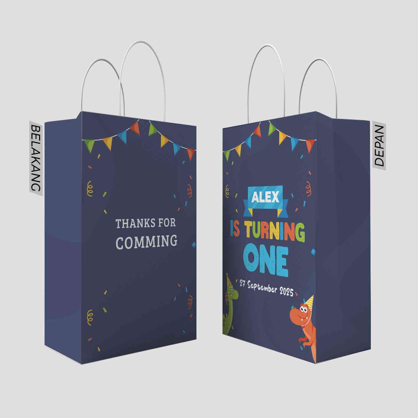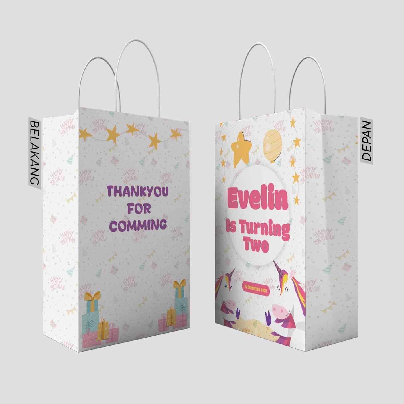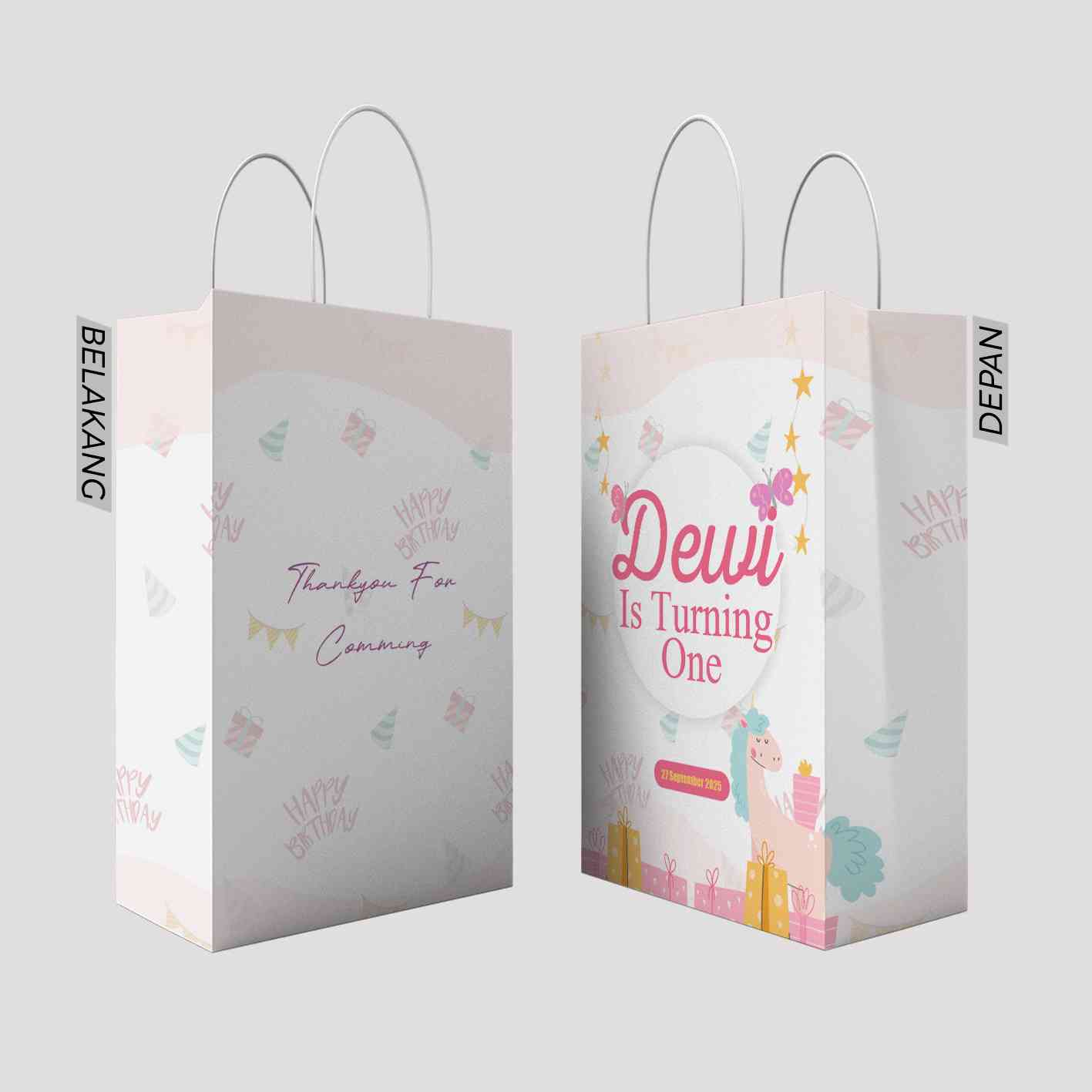 Kantong kado ini menggunakan tema warna pink yang lembut dengan elemen-elemen yang sangat ceria. Di bagian belakang kantong, terdapat tulisan "THANK YOU FOR COMMING" yang diwarnai dengan warna cerah dan dihiasi dengan confetti berwarna-warni, memberikan kesan menyenangkan bagi yang menerimanya. Bagian depan kantong menampilkan tulisan besar "Helen's is Turning One" yang dipadukan dengan ilustrasi kue ulang tahun berwarna cerah, hadiah, serta dekorasi perayaan lainnya. Tema ini memberikan kesan girly dan penuh kegembiraan, cocok untuk merayakan ulang tahun pertama Helen. Desain yang simpel namun menarik ini juga membuat kantong ini terlihat elegan sekaligus ceria.