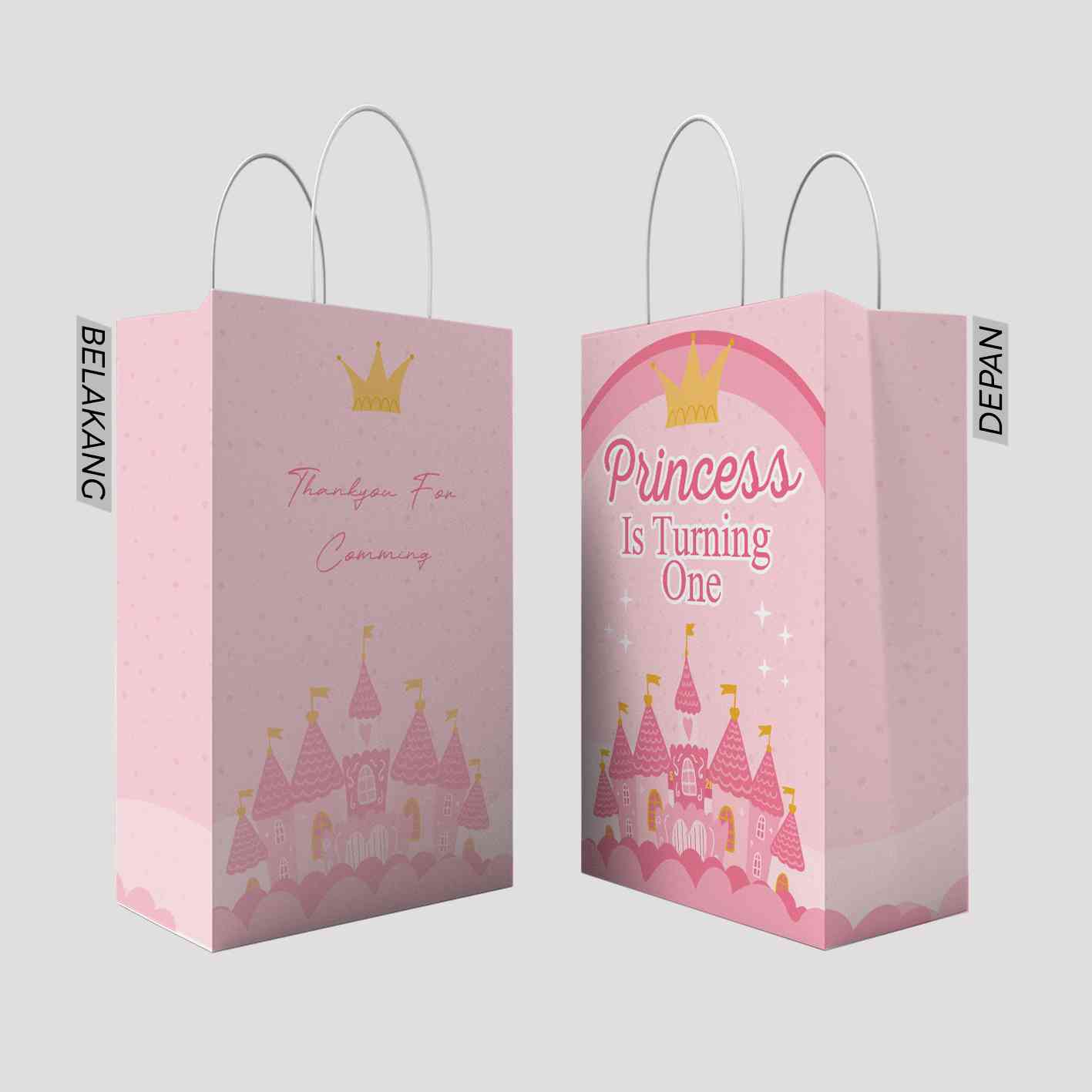 Kantong kado ini menggunakan tema kastil dan mahkota yang sangat cocok untuk merayakan ulang tahun anak perempuan. Dengan warna pink yang lembut, di b...